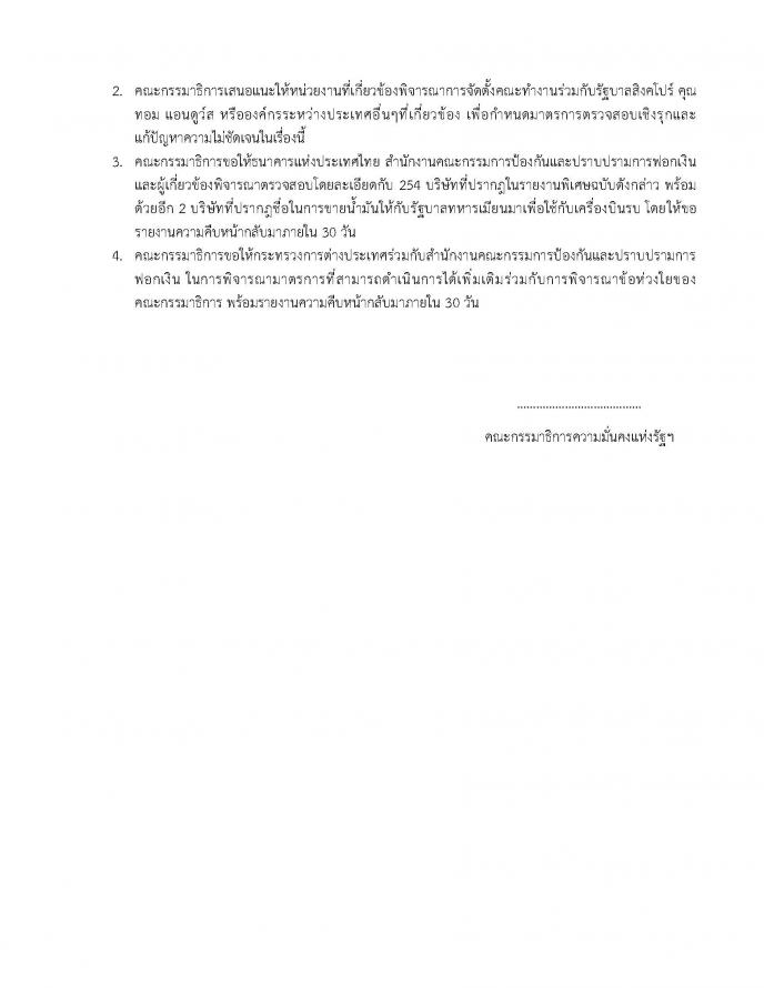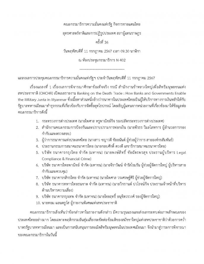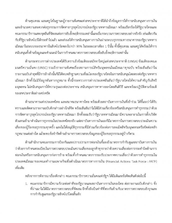 วันพฤหัสบดีที่ 11 กรกฎาคม 2567 เวลา 13.00 นาฬิกา ณ ห้องแถลงข่าว ชั้น 1 อาคารรัฐสภา นายรังสิมันต์ โรม ประธานคณะ กมธ.ความมั่นคงแห่งรัฐ กิจการชายแดนไทย ยุทธศาสตร์ชาติและการปฏิรูปประเทศ และคณะ พร้อมด้วยนายทอม แอนดรูว์ส ผู้รายงานพิเศษแห่งสหประชาชาติ ร่วมแถลงข่าวเกี่ยวกับผลการประชุมคณะ กมธ. ในวันนี้ (11 ก.ค. 67) ซึ่งได้พิจารณาข้อเท็จจริง กรณีสำนักงานข้าหลวงใหญ่เพื่อสิทธิมนุษยชนแห่งสหประชาชาติ (OHCHR) เปิดเผยรายงาน Banking on the Death Trade : How Banks and Governments Enable the Military Junta in Myanmar ซึ่งเนื้อหาส่วนหนึ่งอ้างว่าธนาคารในประเทศไทยเป็นผู้ให้บริการทางการเงินหลักให้กับรัฐบาลทหารเมียนมาทำธุรกรรมที่เกี่ยวข้องกับการจัดซื้อยุทโธปกรณ์ โดยได้เชิญนายทอม แอนดรูว์ส และผู้แทนจากหน่วยงานต่าง ๆ ที่เกี่ยวข้องมาให้ข้อมูลต่อ คณะ กมธ. โดย คณะ กมธ.เห็นว่าข้อกล่าวหาในรายงานดังกล่าว มีความรุนแรงและส่งผลกระทบต่อภาพลักษณ์ของประเทศไทยเป็นอย่างมาก โดยเฉพาะพฤติกรรมอันสุ่มเสี่ยงจะขัดต่อข้อมติของสมัชชาใหญ่แห่งสหประชาชาติว่าด้วยการคว่ำบาตรรัฐบาลทหารเมียนมา และเป็นการสนับสนุนการละเมิดสิทธิมนุษยชนในประเทศเมียนมาจึงนำมาสู่วาระการพิจารณาของ คณะ กมธ. ในวันนี้ ซึ่งหลังจากการพิจารณาเรื่องดังกล่าว คณะ กมธ. ได้มีมติและข้อคิดเห็น ดังนี้ 1. คณะ กมธ. มีความกังวลต่อท่าทีของรัฐบาลและสถาบันทางการเงินของไทย ต่อรายงานฉบับดังกล่าว ซึ่งที่ผ่านมาไม่ได้มีมาตรการตรวจสอบที่ชัดเจน อีกทั้งยังเป็นท่าทีที่ตรงกันข้ามกับมาตรการตรวจสอบเชิงรุกและการกำกับดูแลของรัฐบาลสิงคโปร์ โดยสิ้นเชิง 2. คณะ กมธ. เสนอแนะให้หน่วยงานที่เกี่ยวข้องพิจารณาการจัดตั้งคณะทำงานร่วมกับรัฐบาลสิงคโปร์ คุณทอม แอนดูว์ส หรือองค์กรระหว่างประเทศอื่น ๆ ที่เกี่ยวข้อง เพื่อกำหนดมาตรการตรวจสอบเชิงรุกและแก้ปัญหาความไม่ชัดเจนในเรื่องนี้ 3. ขอให้ธนาคารแห่งประเทศไทย สำนักงานคณะกรรมการป้องกันและปราบปรามการฟอกเงิน และผู้เกี่ยวข้องพิจารณาตรวจสอบโดยละเอียดกับ 254 บริษัท ที่ปรากฏในรายงานพิเศษฉบับดังกล่าว พร้อมด้วยอีก 2 บริษัท ที่ปรากฏชื่อในการขายน้ำมันให้กับรัฐบาลทหารเมียนมาเพื่อใช้กับเครื่องบินรบ โดยให้ขอรายงานความคืบหน้ากลับมาภายใน 30 วัน 4. ขอให้กระทรวงการต่างประเทศร่วมกับสำนักงานคณะกรรมการป้องกันและปราบปรามการฟอกเงิน พิจารณามาตรการที่สามารถดำเนินการได้เพิ่มเติมร่วมกับการพิจารณาข้อห่วงใยของ คณะ กมธ. พร้อมรายงานความคืบหน้ากลับมาภายใน 30 วัน (รายละเอียดตามเอกสารที่แนบ) |