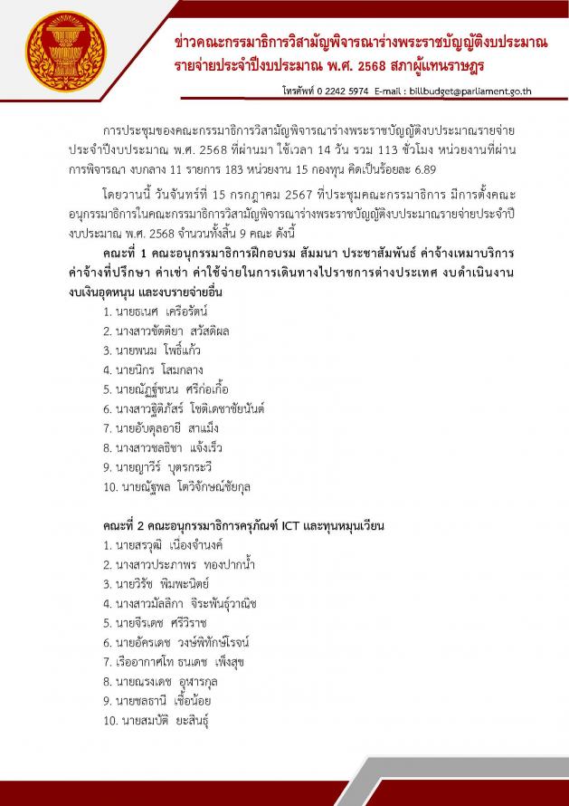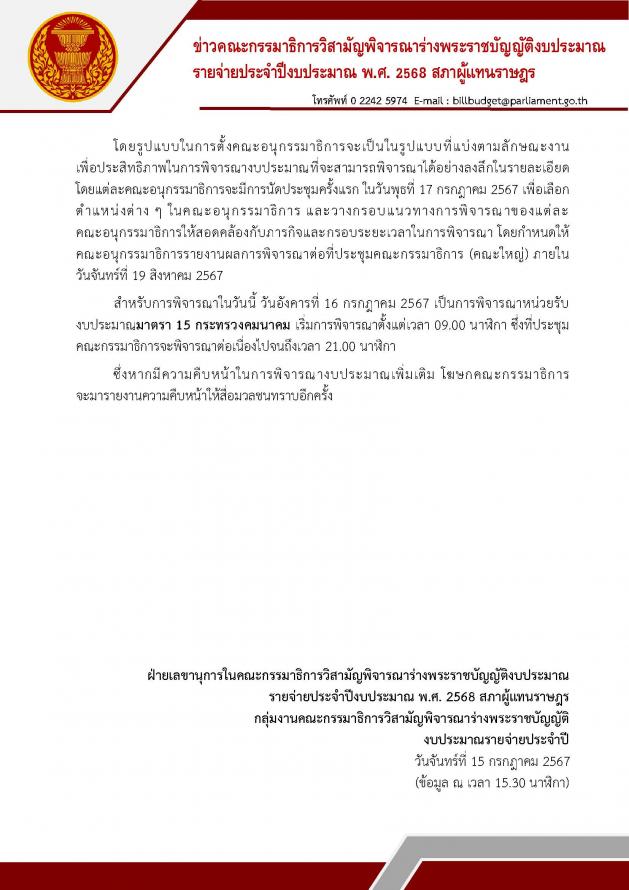 วันอังคารที่ 16 กรกฎาคม 2567 เวลา 09.30 นาฬิกา ณ ห้องแถลงข่าว ชั้น 1 อาคารรัฐสภา นายอนุสรณ์ เอี่ยมสะอาด โฆษกคณะ กมธ. วิสามัญพิจารณาร่าง พ.ร.บ.งบประมาณรายจ่ายประจำปีงบประมาณ พ.ศ. 2568 และคณะ แถลงข่าว เกี่ยวกับการประชุมของคณะกมธ. ที่ผ่านมา ใช้เวลา 14 วัน รวม 113 ชั่วโมง หน่วยงานที่ผ่านการพิจารณา งบกลาง 11 รายการ 183 หน่วยงาน 15 กองทุน คิดเป็นร้อยละ 6.89 เมื่อวานนี้ (15ก.ค. 67) ที่ประชุมคณะกรรมาธิการ มีการตั้งคณะอนุกมธ. ซึ่งแบ่งตามลักษณะงานเพื่อเพิ่มประสิทธิภาพในการพิจารณางบประมาณให้ได้อย่างรอบคอบ จำนวน 9 คณะ ดังนี้ 1. คณะอนุ กมธ.การฝึกอบรม สัมมนาประชาสัมพันธ์ 2. คณะอนุ กมธ.ครุภัณฑ์ ICT และทุนหมุนเวียน 3. คณะอนุ กมธ.สิ่งก่อสร้าง และรัฐวิสาหกิจ 4. คณะอนุ กมธ.ท้องถิ่น เทศบาลนคร เทศบาลเมือง เทศบาลตำบล 5. คณะอนุ กมธ.จังหวัด/กลุ่มจังหวัด องค์การบริหารส่วนจังหวัด กรุงเทพมหานคร และเมืองพัทยา 6. คณะอนุ กมธ.ด้านการศึกษา วิทยาศาสตร์ วิจัยและการถ่ายทอดเทคโนโลยี 7. คณะอนุ กมธ.แผนงานบูรณาการ 8. คณะอนุ กมธ.แผนงานบูรณาการ 2 9. คณะอนุ กมธ.ข้อสังเกต
