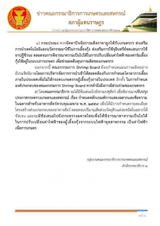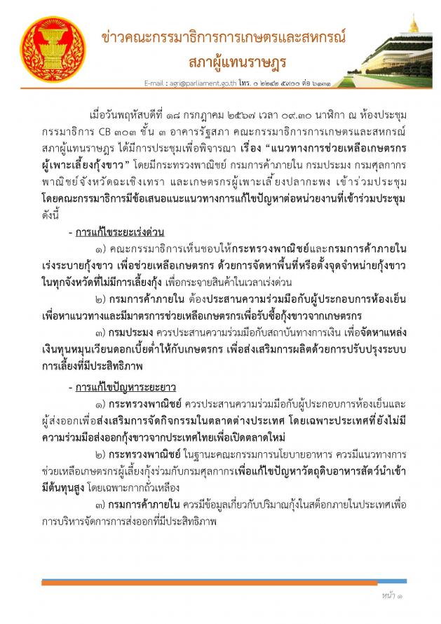วันพฤหัสบดีที่ 18 กรกฎาคม 2567 เวลา 15.30 นาฬิกา ณ ห้องแถลงข่าว ชั้น 1 อาคารรัฐสภา นายศักดินัย นุ่มหนู ประธานคณะ กมธ.การเกษตรและสหกรณ์ และคณะ แถลงข่าวผลการประชุมคณะ กมธ. เรื่อง แนวทางช่วยเหลือเกษตรกรผู้เพาะเลี้ยงกุ้งขาว โดยเชิญหน่วยงานที่เกี่ยวข้องเข้าร่วมประชุม อาทิ กระทรวงพาณิชย์ กรมการค้าภายใน กรมประมง กรมศุลกากร พาณิชย์จังหวัดฉะเชิงเทรา และเกษตรกรผู้เพาะเลี้ยงปลากะพง เข้าร่วมประชุม ซึ่งคณะกมธ. มีข้อเสนอแนะแนวทางการแก้ไขปัญหาต่อหน่วยงานที่เข้าร่วมประชุมทั้งในระยะเร่งด่วนและระยะยาว