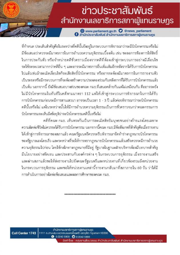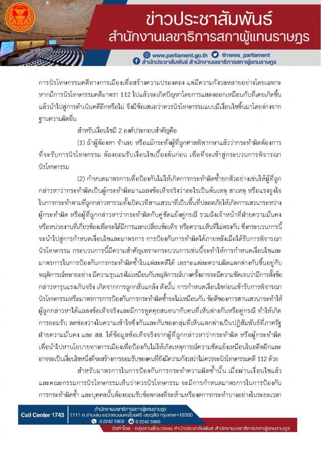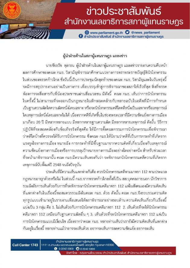 วันพฤหัสบดีที่ 25 กรกฎาคม 2567 เวลา 16.00 นาฬิกา ณ ห้องแถลงข่าว ชั้น 1 อาคารรัฐสภา นายชัยธวัช ตุลาธน ผู้นำฝ่ายค้านในสภาผู้แทนราษฎร แถลงข่าวรายงานความคืบหน้าผลการศึกษาของคณะ กมธ.วิสามัญพิจารณาศึกษาแนวทางการตราพระราชบัญญัตินิรโทษกรรมในส่วนของพรรคก้าวไกล ซึ่งวันนี้เป็นการประชุมนัดสุดท้ายของคณะ กมธ. วิสามัญ และในวันพรุ่งนี้จะมีการสรุปรายงานอย่างเป็นทางการ เพื่อบรรจุเข้าสู่การพิจารณาของสภาให้เร็วที่สุด (รายละเอียดตามที่แนบ) |