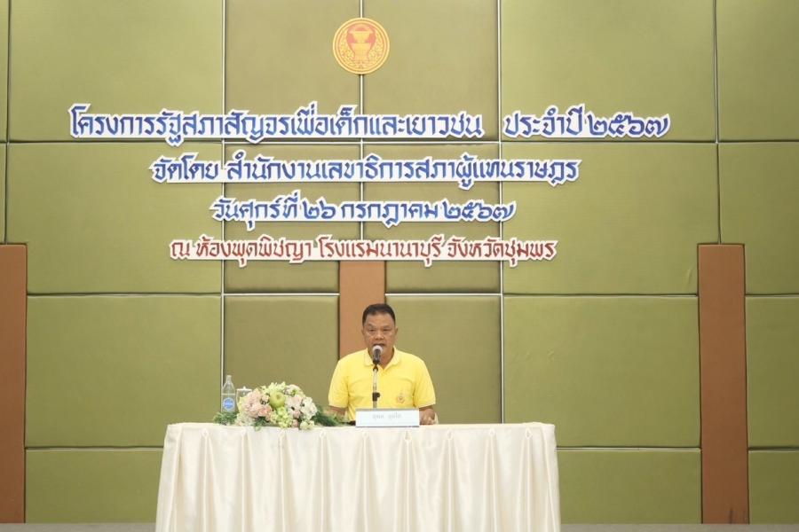 วันศุกร์ที่ 26 กรกฎาคม 2567 เวลา 09.30 นาฬิกา ณ ห้องพุดพิชญา โรงแรมนานาบุรี จ.ชุมพร นายสุพล จุลใส สมาชิกสภาผู้แทนราษฎร จังหวัดชุมพร พรรครวมไทยสร้างชาติ เป็นประธานในพิธีเปิดโครงการรัฐสภาสัญจรเพื่อเด็กและเยาวชน ประจำปีงบประมาณ พ.ศ. 2567 ภาคใต้ ณ จังหวัดชุมพร โดยมี นายณรงค์ศักดิ์ เพชรเรืองสุด วิทยากรเชี่ยวชาญ สำนักงานเลขาธิการสภาผู้แทนราษฎร กล่าวรายงาน ในการนี้ นายวิชัย สุดสวาสดิ์ สมาชิกสภาผู้แทนราษฎร จังหวัดชุมพร พรรครวมไทยสร้างชาติ และว่าที่ ร.ต. มโนชญ์ นาคธรณิศวร์ นักวิชาการศึกษาชำนาญการพิเศษ สำนักงานเขตพื้นที่การศึกษามัธยมศึกษาสุราษฎร์ธานี ชุมพร เข้าร่วมเป็นเกียรติในพิธีเปิดด้วย