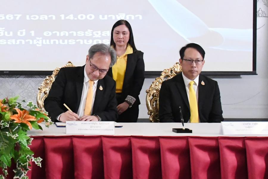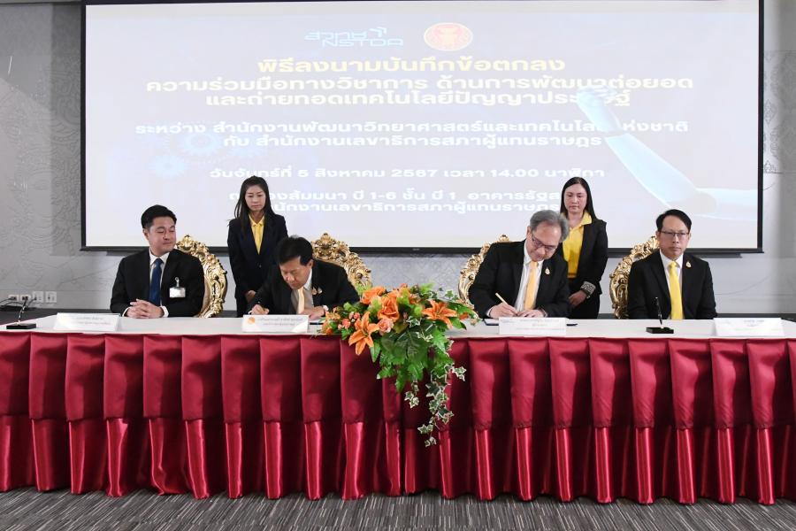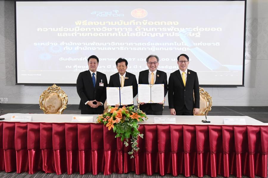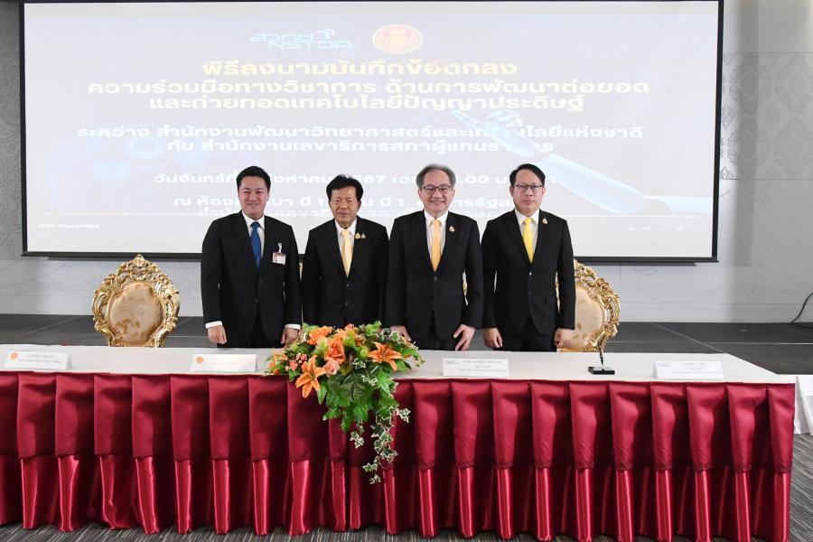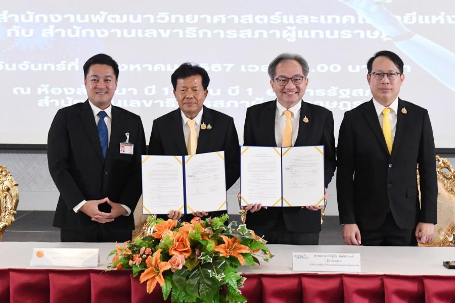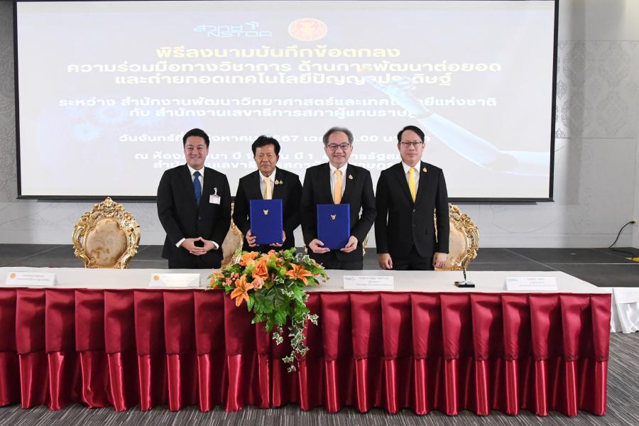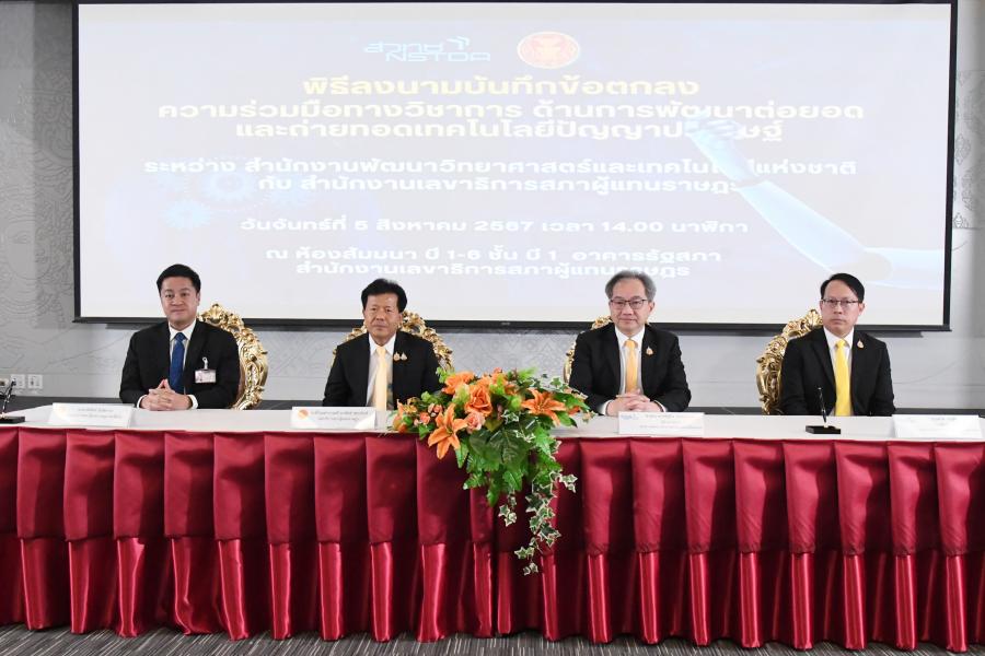วันจันทร์ที่ 5 สิงหาคม 2567 เวลา 14.00 นาฬิกา ณ ห้องประชุมสัมมนา B1 6 ชั้น B1 อาคารรัฐสภา นายปดิพัทธ์ สันติภาดา รองประธานสภาผู้แทนราษฎร คนที่หนึ่ง ให้เกียรติเป็นสักขีพยานในการลงนามบันทึกข้อตกลงความร่วมมือทางวิชาการด้านการพัฒนาต่อยอดและถ่ายทอดเทคโนโลยีปัญญาประดิษฐ์ระหว่างสำนักงานเลขาธิการสภาผู้แทนราษฎร โดย ว่าที่ ร.ต.ต.อาพัทธ์ สุขะนันท์ เลขาธิการสภาผู้แทนราษฎร และสำนักงานพัฒนาวิทยาศาสตร์และเทคโนโลยีแห่งชาติ (สวทช.) โดย ศ.ดร.ชูกิจ ลิมปิจำนงค์ ผู้อำนวยการ สวทช. ในการนี้ นายปดิพัทธ์ สันติภาดา รองประธานสภาผู้แทนราษฎร คนที่หนึ่ง และนายศวิต กาสุริยะ รองผู้อำนวยการศูนย์เทคโนโลยีอิเล็กทรอนิกส์และคอมพิวเตอร์แห่งชาติ (NECTEC) สวทช. ร่วมลงนามเพื่อเป็นสักขีพยาน โดยภายในงานยังมีคณะผู้บริหารจากทั้งสองหน่วยงาน ร่วมพิธี โอกาสนี้ รองประธานสภาผู้แทนราษฎรคนที่หนึ่ง กล่าวต้อนรับผู้เข้าร่วมงาน และกล่าวว่า มีความยินดีเป็นอย่างยิ่งที่ได้รับความร่วมมือจาก สวทช. ที่เป็นผู้เชี่ยวชาญและเป็นตัวจริงในการพัฒนาวิทยาศาสตร์และปัญญาประดิษฐ์ของประเทศไทย ขณะนี้สภาผู้แทนราษฎรมีการตั้งคณะ กมธ.วิสามัญพิจารณาศึกษาแนวทางในการควบคุมและส่งเสริมการใช้เทคโนโลยีปัญญาประดิษฐ์เพื่อรองรับการเปลี่ยนแปลงในอนาคต เพราะตระหนักดีว่าเรื่องดังกล่าวเป็นเรื่องที่มีความสำคัญ สภาฯ นอกจากจะเป็นสถานที่ในการออกกฎหมายแล้ว ยังมีความจำเป็นอย่างยิ่งที่จะต้องนำปัญญาประดิษฐ์มาใช้เพื่อพัฒนาประสิทธิภาพในการดำเนินงานของสภาฯ เพื่อประโยชน์ต่อพี่น้องประชาชนและประเทศชาติ ในส่วนของสภาฯ เอง มีคลังข้อมูลขนาดใหญ่คือ คลังข้อมูลนิติบัญญัติ ไม่ว่าจะเป็น ร่างรัฐธรรมนูญ รายงานของคณะ กมธ. รายงานการประชุม ซึ่งเป็นทรัพย์สินที่มีค่าเป็นอย่างมาก ทั้งในแง่ประวัติศาสตร์และการต่อยอดในอนาคต แต่ศักยภาพของมนุษย์เองยังใช้ข้อมูลเหล่านี้ในจำนวนที่จำกัด หากมีปัญญาประดิษฐ์เข้ามาช่วยก็จะสามารถอำนวยความสะดวกให้กับประชาชนได้เป็นอย่างมาก และในแง่ของบุคลากรเองจะได้นำศักยภาพไปทำงานด้านที่จำเป็นในการใช้ทักษะของมนุษย์ วันนี้เป็นโอกาสอันดีสำหรับความร่วมมือที่จะเกิดขึ้น รายละเอียดในบันทึกความตกลงร่วมกันฯ มีความละเอียดรอบคอบและมีความเป็นรูปธรรมในการเปิดเผยข้อมูล การเก็บรักษาข้อมูล มีการกำหนดให้มีเจ้าหน้าที่ของแต่ละฝ่ายรับผิดชอบประสานงานในฐานข้อมูลร่วมกัน สำหรับความร่วมมือดังกล่าว มีวัตถุประสงค์เพื่อร่วมมือในการพัฒนาเทคโนโลยีปัญญาประดิษฐ์ (Artficial Intelligence : Al) สอดค