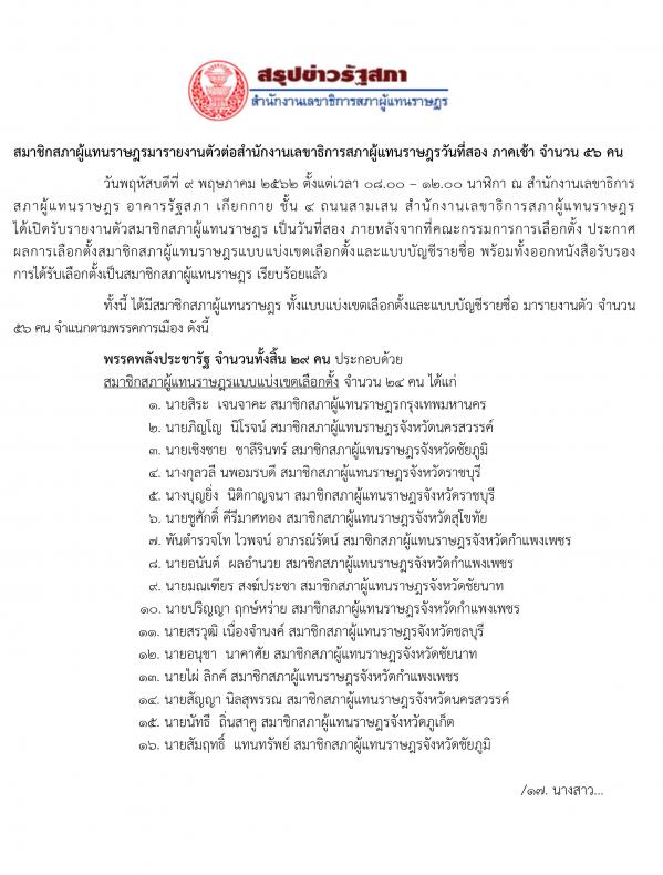 สมาชิกสภาผู้แทนราษฎรแบบแบ่งเขตเลือกตั้ง เดินทางมารายงานตัว ช่วงเช้า (ต่อ) เป็นวันที่สอง