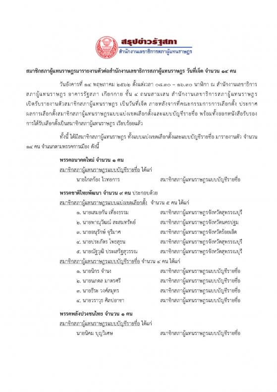 สมาชิกสภาผู้แทนราษฎรแบบแบ่งเขตเลือกตั้ง เดินทางมารายงานตัว เป็นวันที่เจ็ด