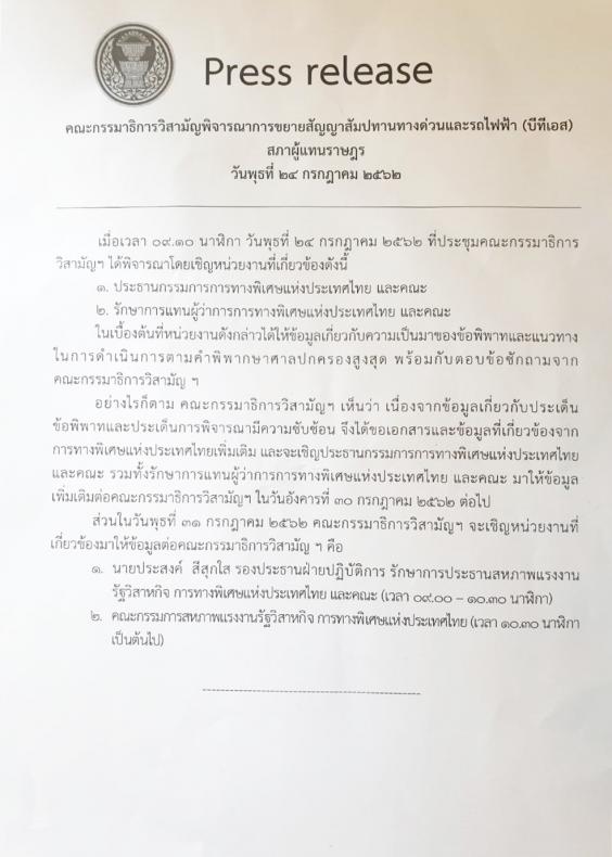 (บีทีเอส) แถลงถึงผลการประชุมโดยที่ประชุมคณะกรรมาธิการวิสามัญฯ ได้เชิญ