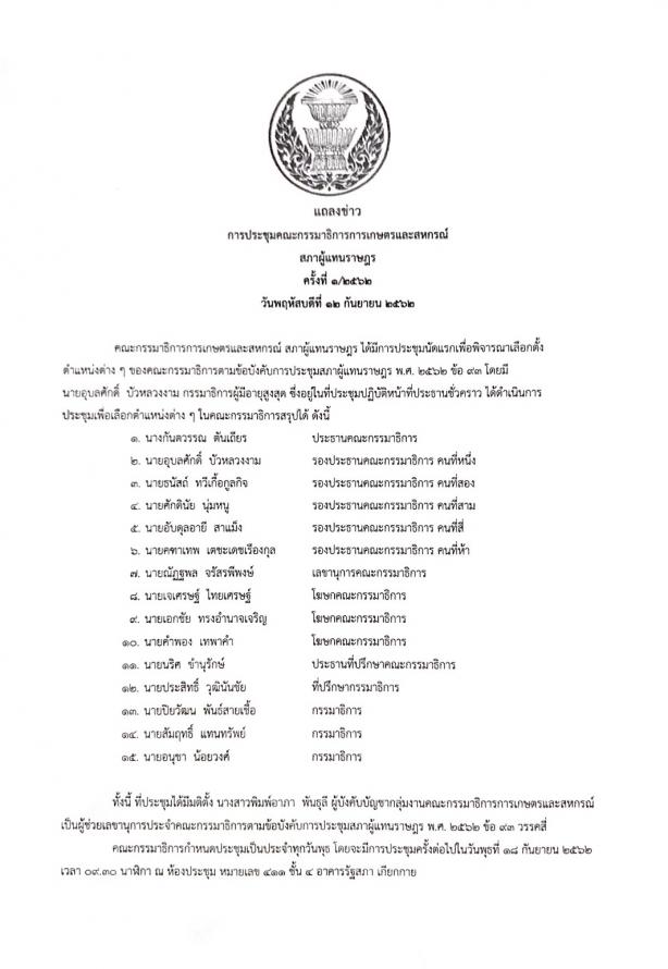 แถลงข่าวผลการประชุมคณะกรรมาธิการการเกษตรและสหกรณ์ ภายหลังการประชุมครั้งแรก เพื่อ