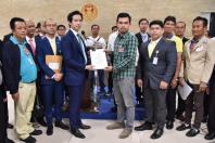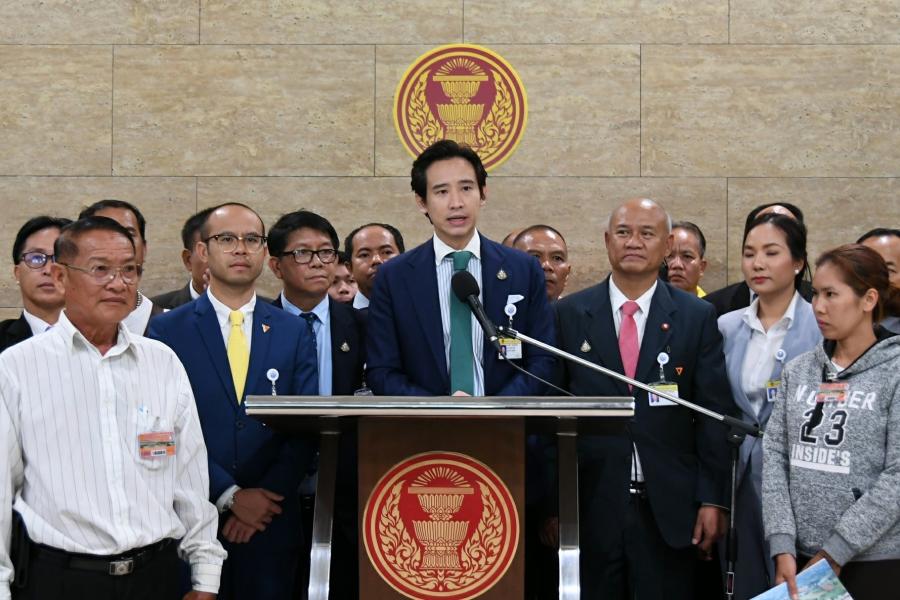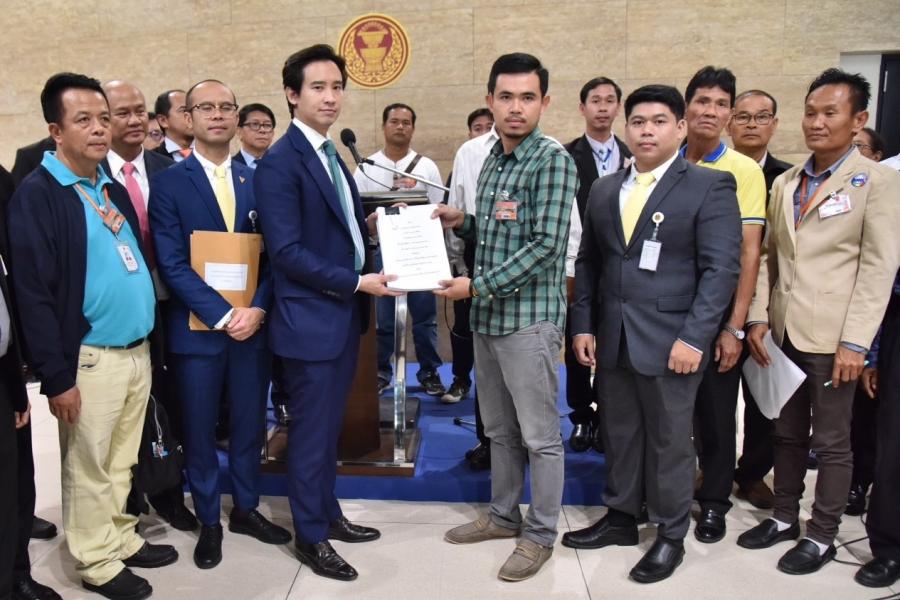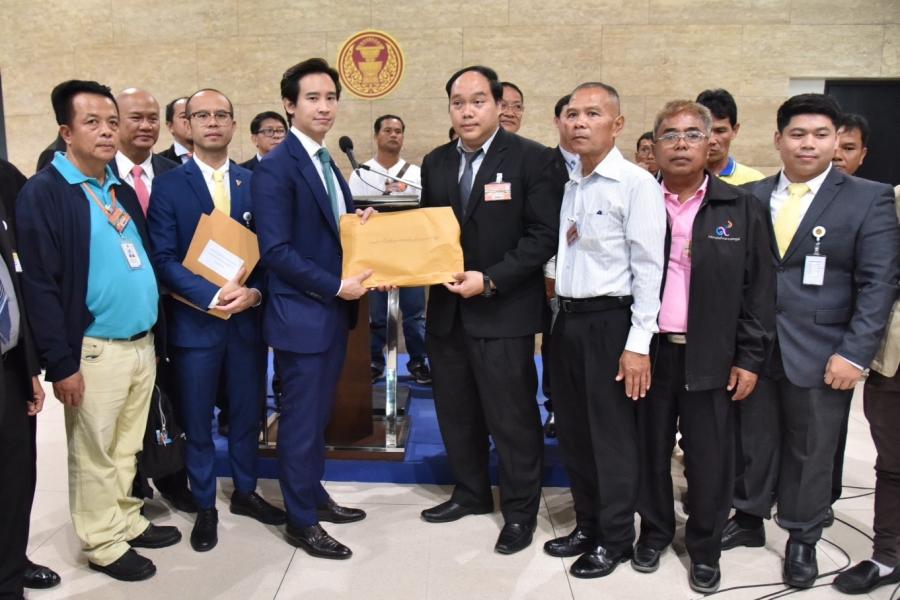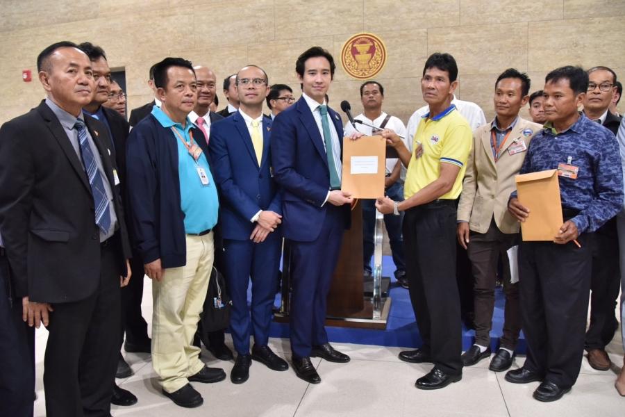 เกียกกาย นายพิธา ลิ้มเจริญรัตน์ สมาชิกสภาผู้แทนราษฎรพรรคอนาคตใหม่ รับยื่นหนังสือจากตัวแทน
