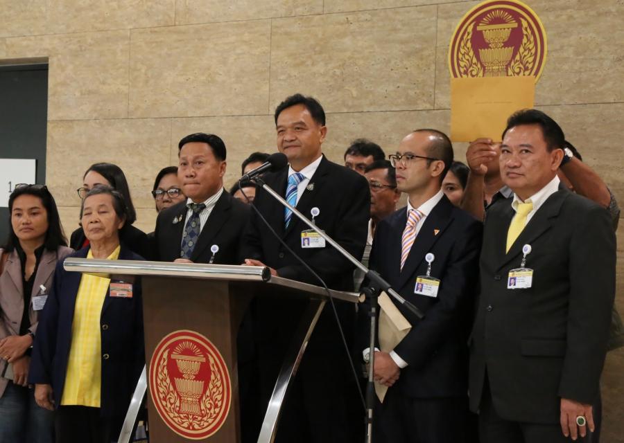 นายอภิชาติ ศิริสุนทร รับยื่นหนังสือจากประธานกลุ่มสัจจสมทรัพย์ที่พักสงฆ์ เพื่อขอความเป็นธรรม ในสิทธิครอบครอง สค. อายุ ๑๐๐ ปี