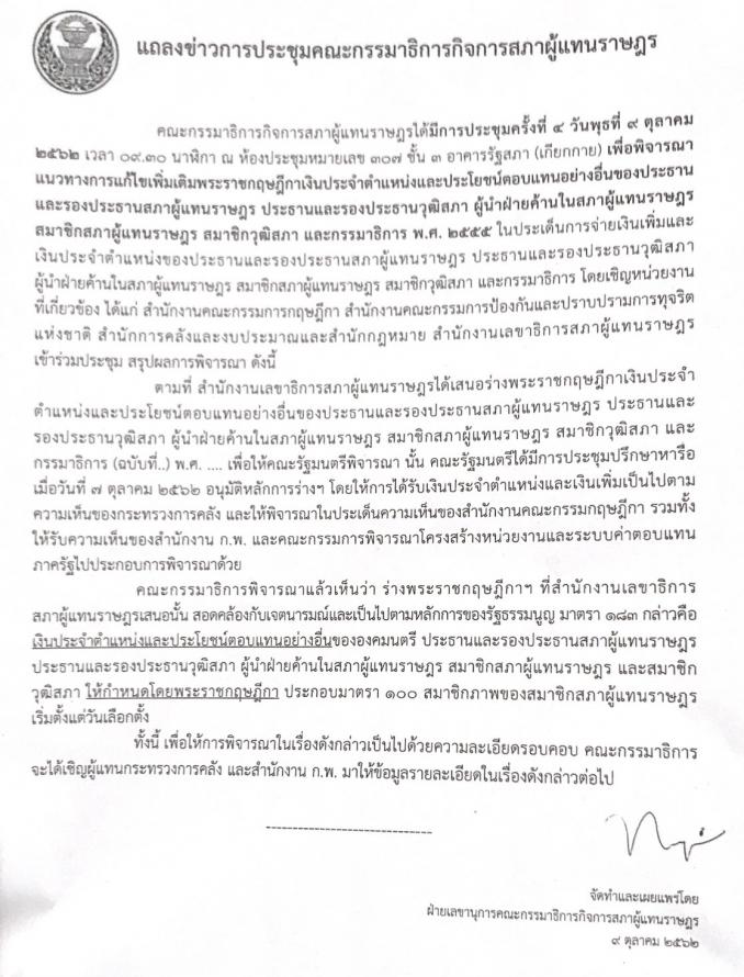 และประโยชน์ตอบแทนอย่างอื่นของประธานและรองประธานสภาผู้แทนราษฎร