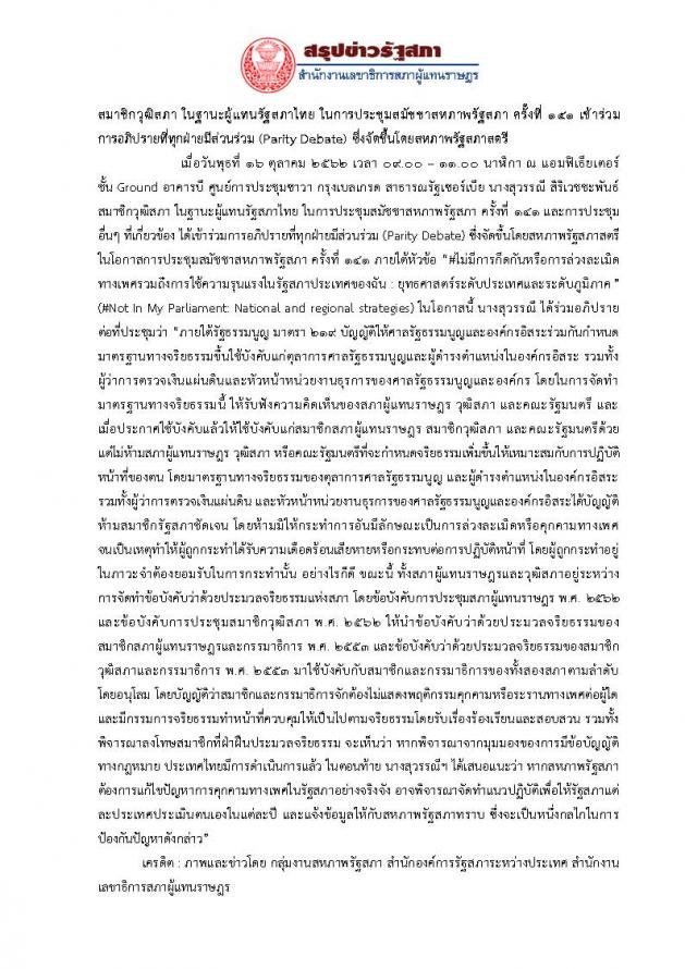 สมาชิกวุฒิสภา ในฐานะผู้แทนรัฐสภาไทย ในการประชุมสมัชชาสหภาพรัฐสภา ครั้งที่ ๑๔๑ เข้าร่วม การอภิปรายที่ทุกฝ่ายมีส่วนร่วม (Parity Debate) ซึ่งจัดขึ้นโดยสหภาพรัฐสภาสตรี