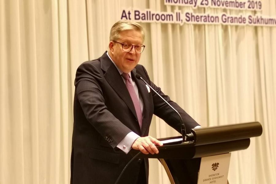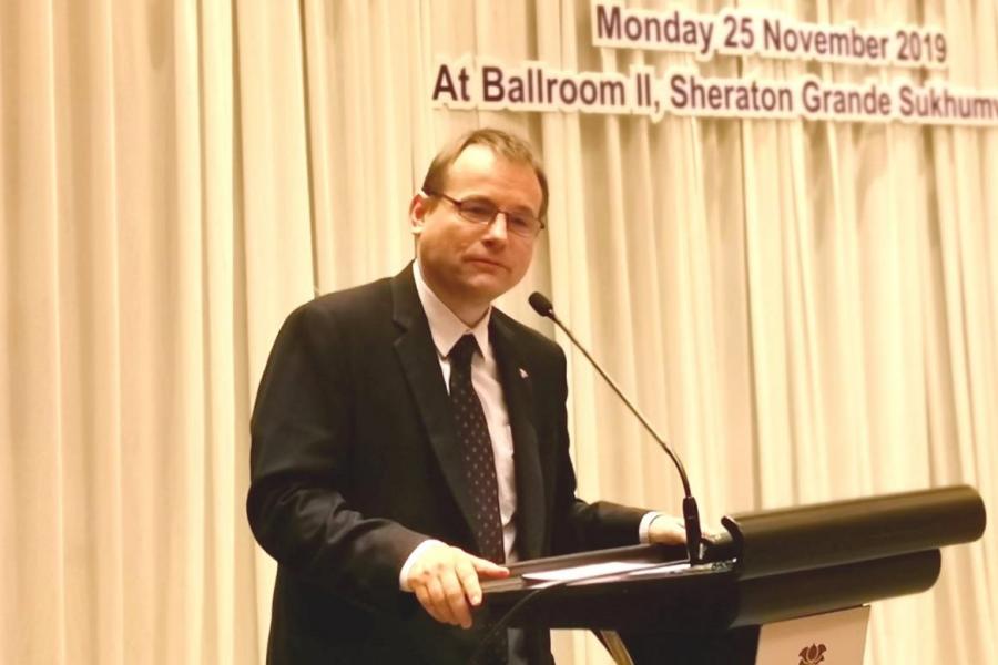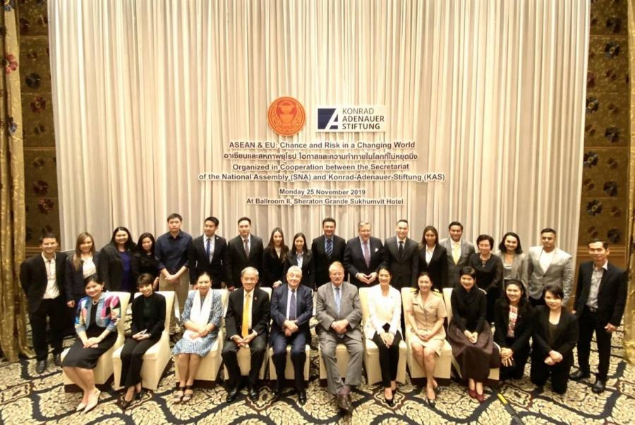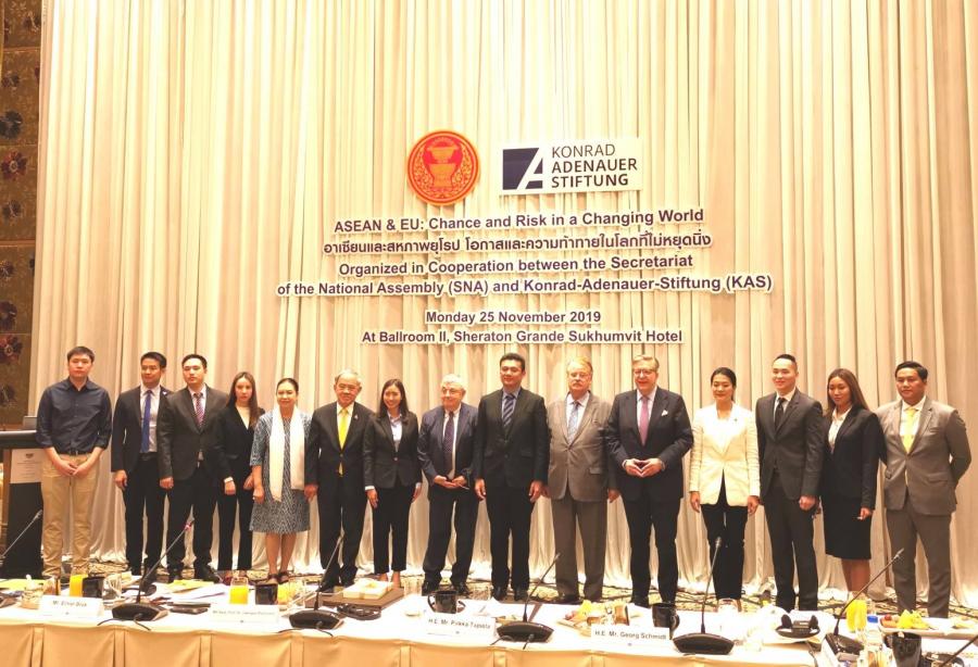 | วันจันทร์ที่ ๒๕ พฤศจิกายน ๒๕๖๒ เวลา ๑๐.๒๐ นาฬิกา ณ โรงแรมเชอราตัน แกรนด์ สุขุมวิท กรุงเทพฯ นาย เก-ออค ชมิดท์ เอกอัครราชทูตสหพันธ์สาธารณรัฐเยอรมนีประจำ ประเทศไทย กล่าวปาฐกถาเปิดการสัมมนาในหัวข้อ อาเซียนและสหภาพยุโรป โอกาสและ ความท้าทายในโลกที่ไม่หยุดนิ่ง โดยมี นายเปียร์ก้า ตาปิโอลา เอกอัครราชทูตสหภาพยุโรป ประจำประเทศไทย กล่าวต้อนรับ และนายจอร์จ แกฟโรน ผู้แทนมูลนิธิคอนราดอาเดนาวร์ ประจำประเทศไทย กล่าวแนะนำการสัมมนา และในเวลา ๑๐.๓๕ นาฬิกา นายเอลม่าร์ โบรค สมาชิกรัฐสภายุโรป (ปี ๒๕๒๓ - ๒๕๖๒) ที่ปรึกษาของประธานคณะ กมธ.ยุโรป และอดีตหัวหน้าคณะ กมธ.ยุโรปด้านการต่างประเทศ และนายจักรพันธ์ พรนิมิตร รองประธานคณะ กมธ. การต่างประเทศ คนที่หนึ่ง กล่าวปาฐกถา ในหัวข้อดังกล่าวข้างต้น มีใจความตอนหนึ่งว่า ประเทศไทยได้จัดทำยุทธศาสตร์ชาติ เพื่อเป็น กรอบการพัฒนาประเทศในระยะยาว เพื่อให้บรรลุวิสัยทัศน์ "ประเทศไทย มีความมั่นคง มั่งคั่ง ยั่งยืน" เป็นประเทศพัฒนาแล้วด้วยการพัฒนาตามหลักปรัชญาเศรษฐกิจพอเพียง โดยปัจจัย ของความสำเร็จในอนาคตซึ่งขึ้นอยู่กับการทำงานอย่างร่วมมือร่วมใจกันบนพื้นฐานของ หลักการ ๓ M คือ ความไว้เนื้อเชื่อใจ (Mutual Trust) การเคารพซึ่งกันและกัน (Mutual Respect) และการมีผลประโยชน์ร่วมกัน (Mutual Benefit) รวมทั้งการขับเคลื่อนอาเซียน สู่ยุคของการปฏิวัติอุตสาหกรรมครั้งที่ ๔ เพื่อให้อาเซียนก้าวทันโลก และก้าวไกลสู่อนาคต อย่างยั่งยืน ทั้งนี้ ในฐานะสมาชิกรัฐสภามีความมุ่งมั่นที่จะเปลี่ยนแปลงประเทศไทยให้ก้าวไปข้างหน้า ตลอดจนร่วมขับเคลื่อนและพัฒนาประเทศเพื่อคนรุ่นหลังต่อไป จากนั้นเป็นการแลกเปลี่ยนประสบการณ์ระหว่างคณะ กมธ.การต่างประเทศ สมาชิกรัฐสภา และผู้เข้าร่วมสัมมนา สำหรับการจัดสัมมนาดังกล่าวมูลนิธิคอนราดอาเดนาวร์ จัดขึ้นโดยมีวัตถุประสงค์ เพื่อเสริมสร้างความเข้าใจอันดีและแลกเปลี่ยนองค์ความรู้ ตลอดจนสร้างเครือข่ายระหว่างรัฐสภาไทย และรัฐสภายุโรป โอกาสนี้ น.ส.เพชรชมพู กิจบูรณะ โฆษกคณะ กมธ. น.ส.ธีรรัตน์ สำเร็จวาณิชย์ เลขานุการคณะ กมธ. ศ.โกวิทย์ พวงงาม สมาชิกสภาผู้แทนราษฎร และสมาชิกวุฒิสภาเข้าร่วม สัมมนาด้วย