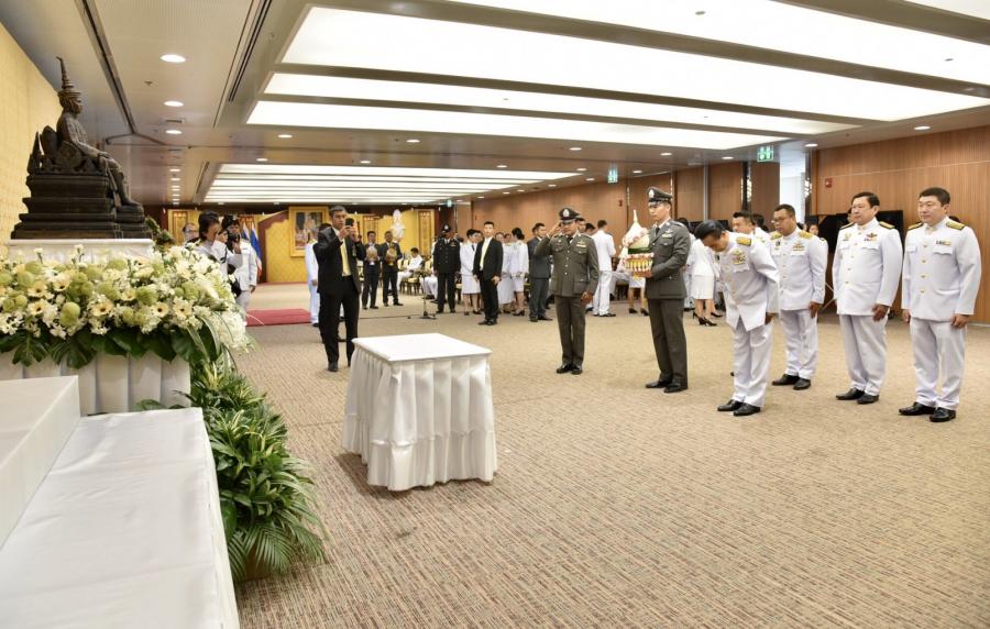 สมาชิกฯ วางพานประดับพุ่มดอกไม้ถวายบังคมพระรูปต้นแบบพระบาทสมเด็จพระปกเกล้าเจ้าอยู่หัว