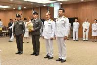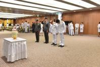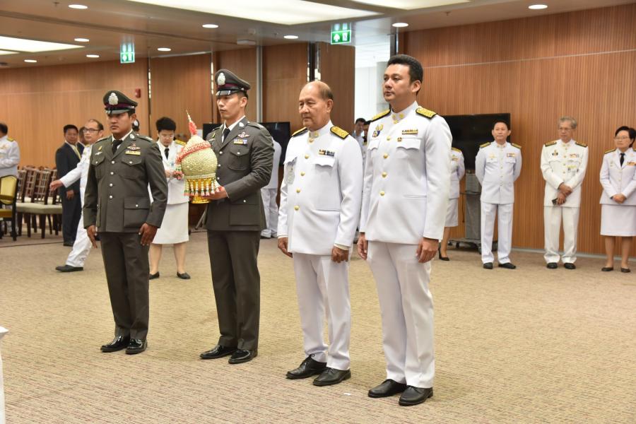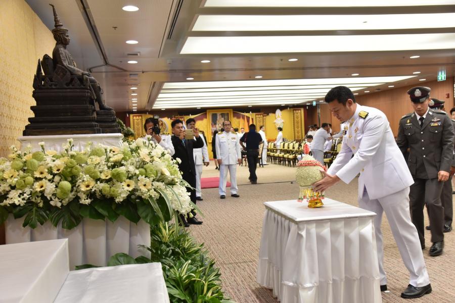 วางพานประดับพุ่มดอกไม้ถวายบังคมพระรูปต้นแบบพระบาทสมเด็จพระปกเกล้าเจ้าอยู่หัว ในนาม
