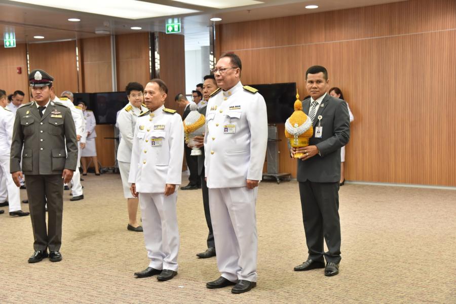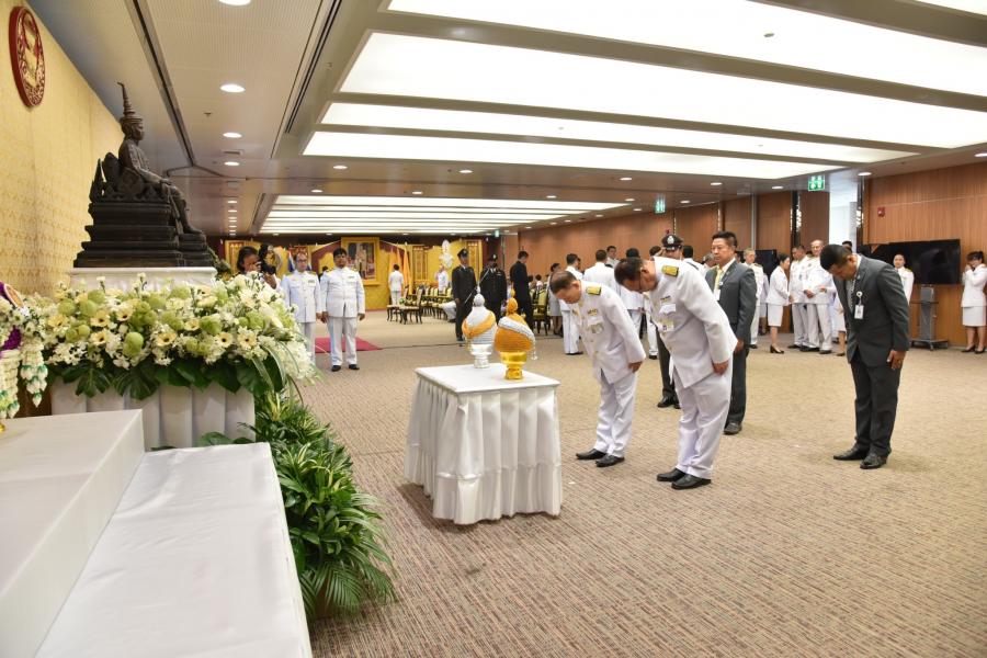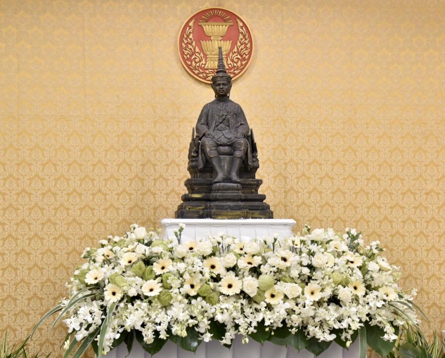 วางพานประดับพุ่มดอกไม้ถวายบังคมพระรูปต้นแบบพระบาทสมเด็จพระปกเกล้าเจ้าอยู่หัว ในนาม