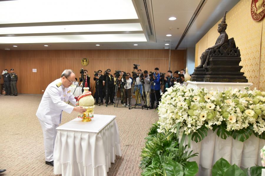 ราษฎร วางพานประดับพุ่มดอกไม้ถวายบังคมพระรูปต้นแบบพระบาทสมเด็จพระปกเกล้าเจ้าอยู่หัว