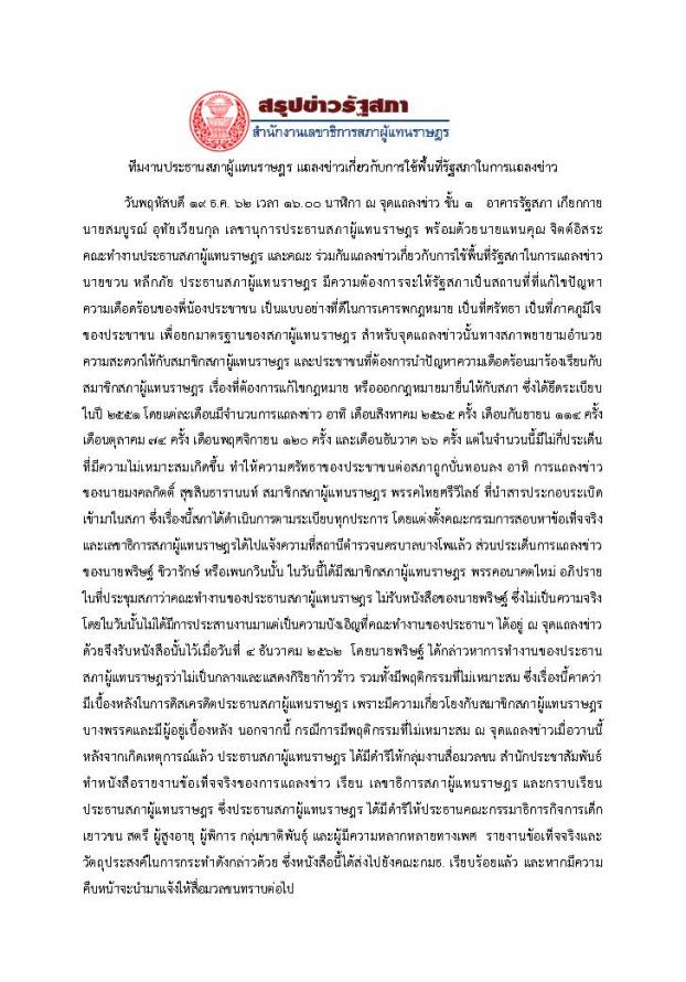 วันพฤหัสบดีที่ ๑๙ ธันวาคม ๒๕๖๒ เวลา ๑๖.๐๐ นาฬิกา ณ จุดแถลงข่าว ชั้น ๑ อาคารรัฐสภา