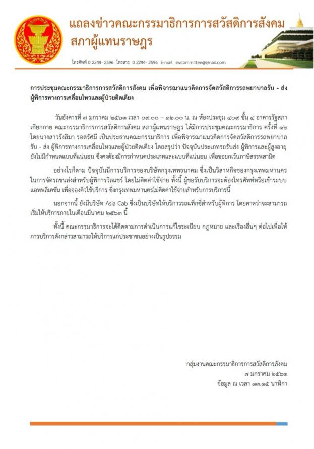 คณะกรรมาธิการ ครั้งที่ ๑๒ เพื่อพิจารณาแนวคิดการจัดสวัสดิการบริการรถพยาบาลรับ ส่ง ผู้พิการ
