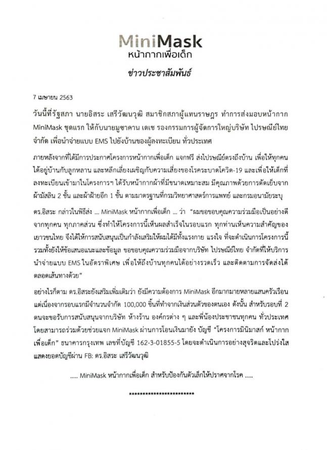 ในฐานะผู้ริเริ่มโครงการ MiniMask หน้ากากเพื่อเด็กส่งมอบหน้ากากอนามัยชุดแรก