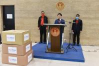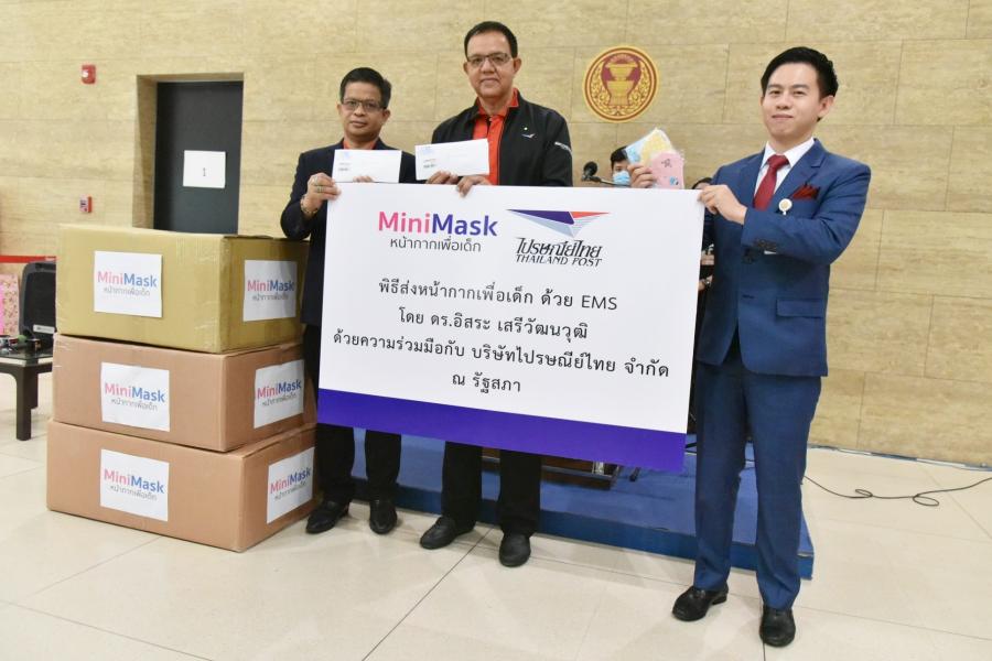 นายอิสระ เสรีวัฒนวุฒิ ส.ส. พรรคประชาธิปัตย์ ในฐานะผู้ริเริ่มโครงการ MiniMask หน้ากากเพื่อเด็ก ส่งมอบหน้ากากอนามัยชุดแรก ให้แก่นายมูซาคาน เดเช รองกรรมการผู้จัดการใหญ่ บริษัท ไปรษณีย์ไทย จำกัด