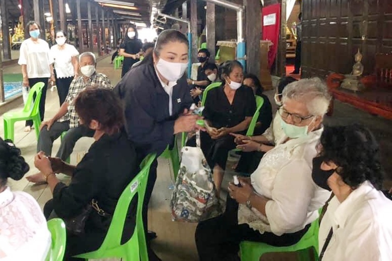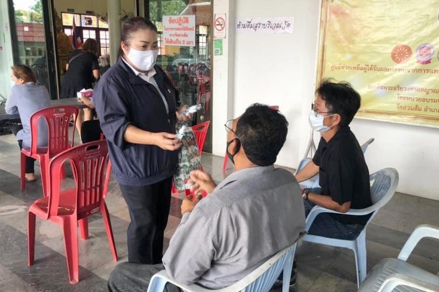 นางสาวจอมขวัญ กลับบ้านเกาะ สมาชิกสภาผู้แทนราษฎร จังหวัดสมุทรสาคร มอบสเปรย์แอลกอฮอล์ ให้แก่ประชาชนในพื้นที่เพื่อช่วยเหลือและบรรเทาความเดือดร้อนในช่วงวิกฤต โควิด-๑๙