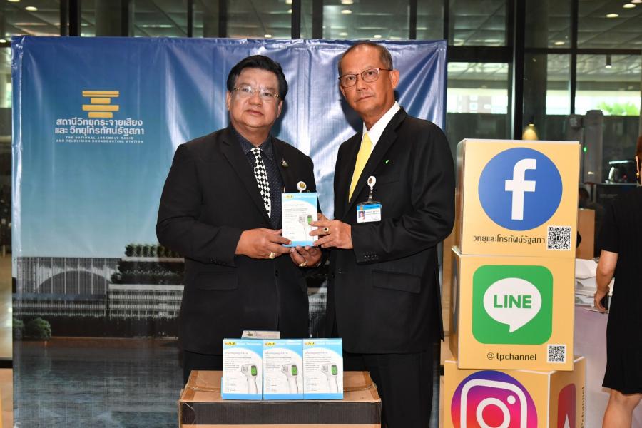 นายสมบูรณ์ อุทัยเวียนกุล เลขานุการประธานสภาผู้แทนราษฎร และคณะทำงานประธานสภาผู้แทนราษฎร รับมอบหน้ากากอนามัย และเทอร์โมมิเตอร์วัดอุณหภูมิ จากนายภูวิช ปัญญาสิทธิ์ กรรมการตรวจสอบและกรรมการอิสระ บมจ. เอเจ แอดวานซ์ เทคโนโลยี