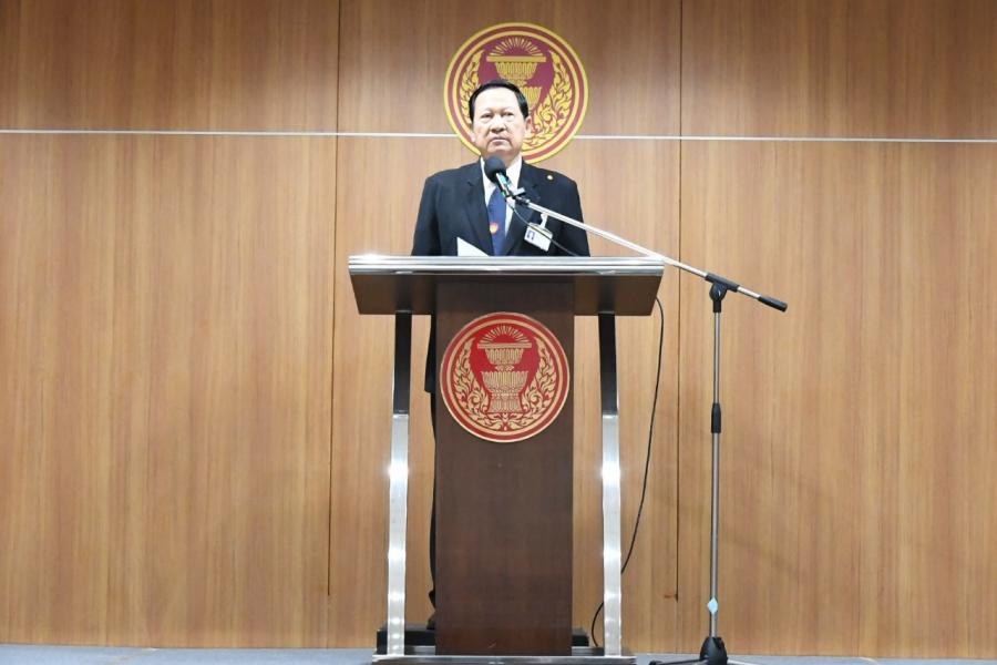 นายอุบลศักดิ์ บัวหลวงงาม ประธานคณะอนุกรรมาธิการวิสามัญพิจารณาศึกษาแนวทางการบริหารจัดการกลุ่มลุ่มน้ำเจ้าพระยา ป่าสัก แถลงข่าว
