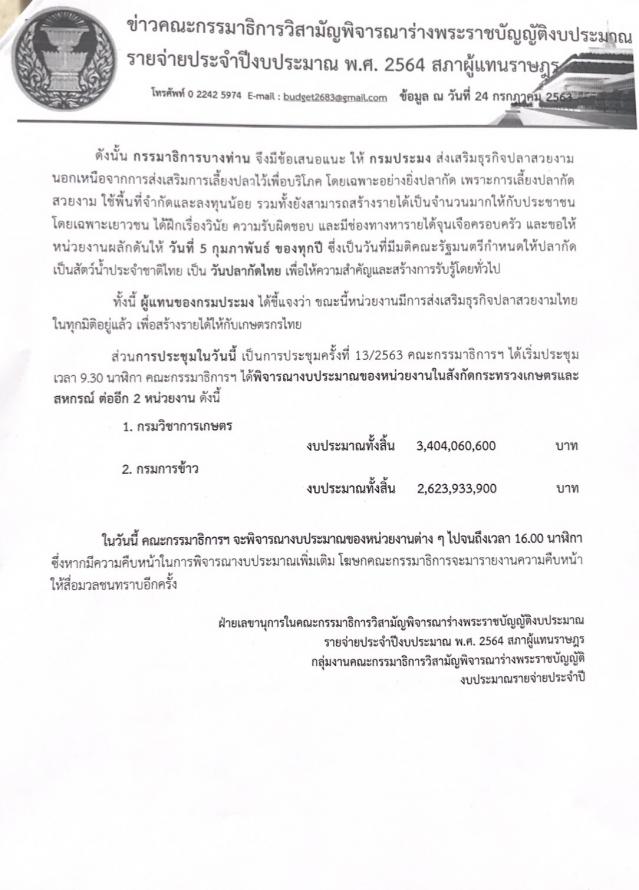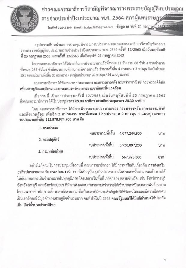 หน้าที่ในวันพุธที่ ๒๙ ก.ค. ๖๓ ทั้งนี้ คณะอนุ กมธ.มีหน้าที่ในการพิจารณาปรับลดงบประมาณ