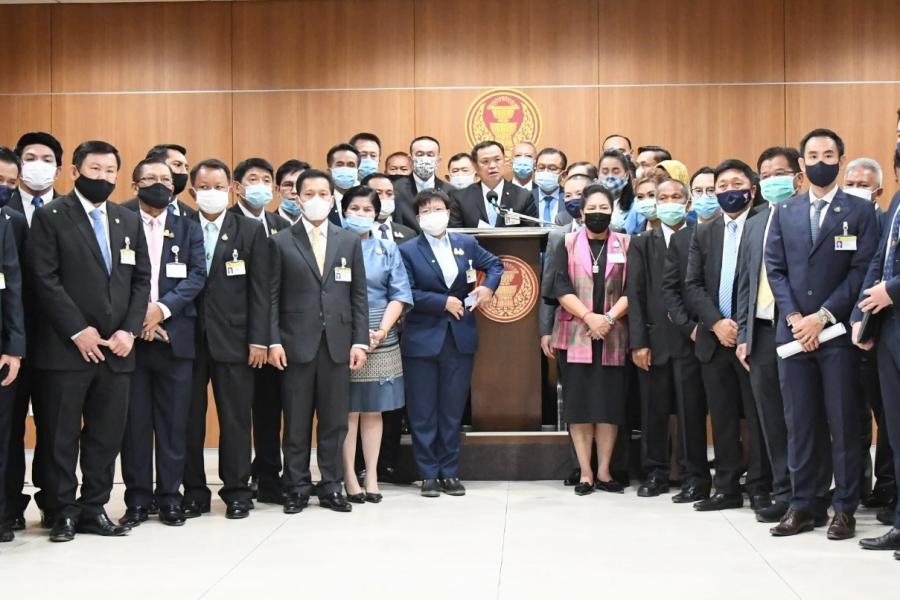 นายอนุทิน ชาญวีรกูล รองนายกรัฐมนตรีและ รมว.สาธารณสุข พร้อมด้วยนายศุภชัย โพธิ์สุ รองประธานสภาผู้แทนราษฎร คนที่สอง และ ส.ส.พรรคภูมิใจไทย แถลงข่าว