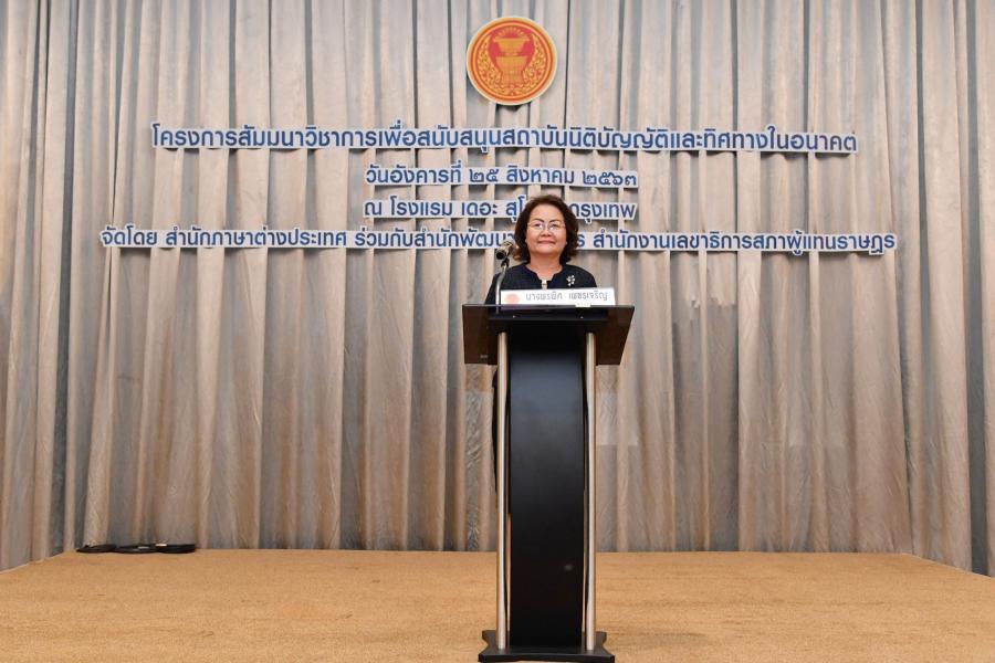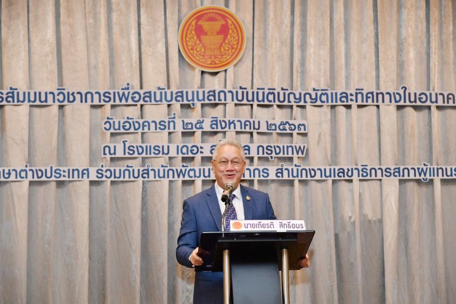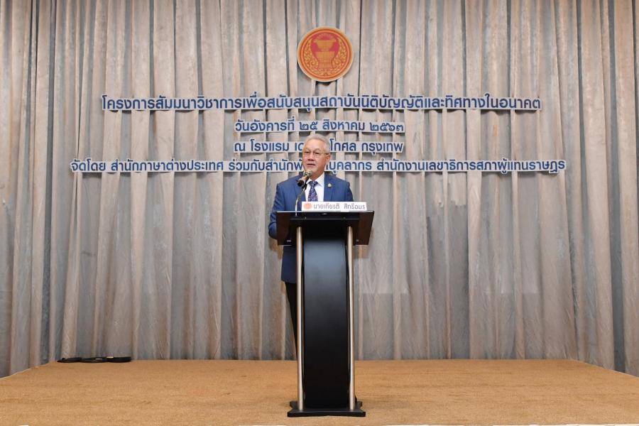 จากนั้น ในเวลา ๐๙.๑๐ น. นายเกียรติ สิทธีอมร สมาชิกสภาผู้แทนราษฎร/เลขาธิการหน่วยประจำชาติไทยในสหภาพรัฐสภา(IPU) และรองประธานคณะ กมธ. การต่างประเทศปาฐกถาพิเศษ เรื่อง บทบาทการทูตรัฐสภา : แนวทางการพัฒนางานวิชาการเพื่อสนับสนุนงานด้านต่างประเทศของรัฐสภา