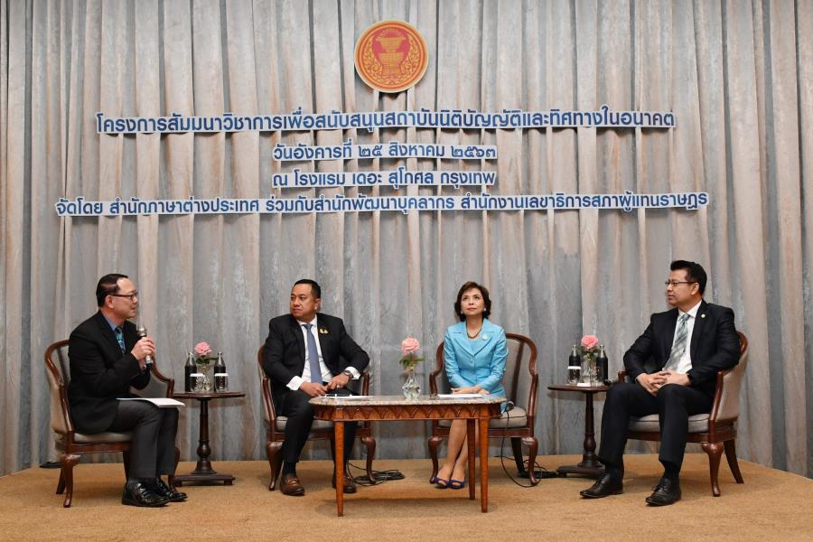 และในเวลา ๑๐.๐๐ น. เป็นการเสวนา หัวข้อ ทิศทางการพัฒนางานวิชาการเพื่อสนับสนุนภารกิจรัฐสภาด้านต่างประเทศ โดย รศ.ดร. กิตติ ประเสริฐสุข รองอธิการบดีฝ่ายวิเทศสัมพันธ์มหาวิทยาลัยธรรมศาสตร์นางสุวรรณี สิริเวชชะพันธ์ สมาชิกวุฒิสภา และนายณัฏฐ์ชนน ศรีก่อเกื้อ สมาชิกสภาผู้แทนราษฎร ดำเนินรายการโดย นายนาถะ ดวงวิชัย ผู้บังคับบัญชากลุ่มงานประธานรัฐสภา สำนักงานเลขาธิการสภาผู้แทนราษฎร