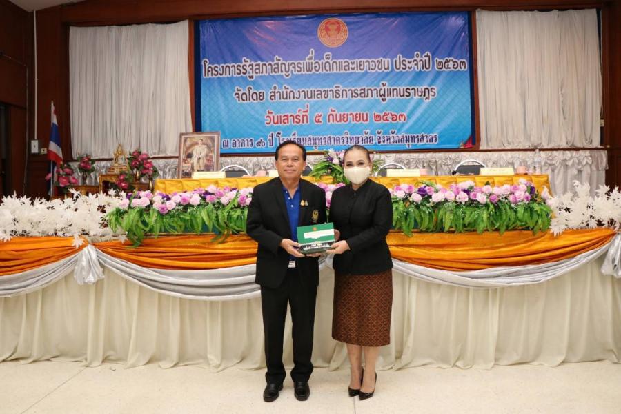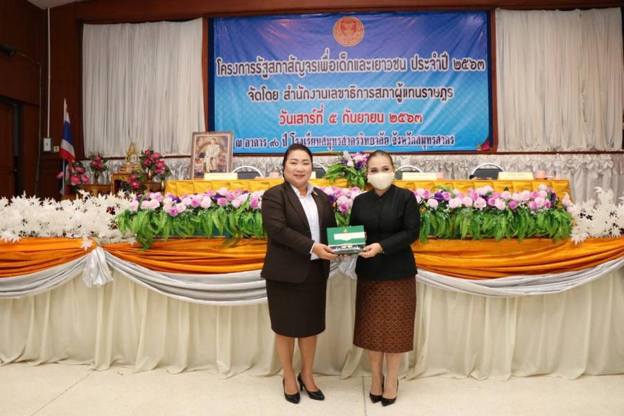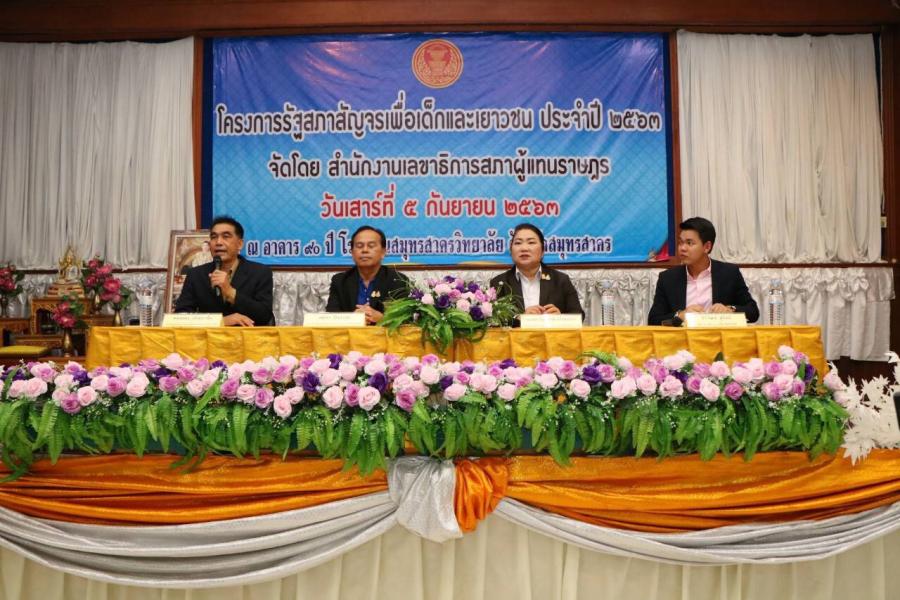 วันเสาร์ที่ ๕ กันยายน ๒๕๖๓ เวลา ๑๐.๐๐ ๑๒.๐๐ นาฬิกา ณ หอประชุม ๙๐ ปี โรงเรียนสมุทรสาครวิทยาลัย จ.สมุทรสาคร นายทองแดง เบ็ญจะปัก สมาชิกสภาผู้แทนราษฎร จ.สมุทรสาคร เขต ๑ พรรคก้าวไกล นายสมัคร ป้องวงษ์ สมาชิกสภาผู้แทนราษฎร จ.สมุทรสาคร เขต ๒ พรรคชาติพัฒนา นางสาวจอมขวัญ กลับบ้านเกาะ สมาชิกสภาผู้แทนราษฎร จ.สมุทรสาคร เขต ๓ พรรคพลังประชารัฐ ร่วมเป็นวิทยากรในการเสวนาวิชาการ เรื่อง บทบาทของเยาวชน กับการมีส่วนร่วมทางการเมือง โดยมีนายธีร์วัฒน์ ชูรัตน์ ผู้ประกาศข่าวสถานีโทรทัศน์ NBT ยุวชนประชาธิปไตย ๒๕๕๗ จังหวัดชุมพร เป็นผู้ดำเนินรายการ บรรยากาศในการเสวนาได้เปิด โอกาสให้เยาวชน ระดับมัธยมศึกษาตอนปลายจากโรงเรียนในจังหวัดสมุทรสาคร ที่เข้าร่วมกิจกรรม ทั้ง ๑๑ โรงเรียนของจังหวัดสมุทรสาคร จำนวน ๓๐๐ คน ได้ร่วมกันเสนอความคิดเห็น ตั้งประเด็น คำถาม และร่วมอภิปรายในประเด็นต่างๆ ทั้งสถานการณ์ทางการเมือง ประเด็นความเหลื่อมล้ำทาง เศรษฐกิจ และสังคม การเปิดโอกาสให้เยาวชนได้ร่วมแสดงออกซึ่งสิทธิ เสรีภาพของเยาวชน การเข้ามามีส่วนร่วมทางการเมือง การแก้ไขรัฐธรรมนูญ การลดความเหลื่อมล้ำทางการศึกษา การดำเนินคดีทางการเมือง สถานการณ์ความมั่นคงของประเทศ บทบาทหน้าที่และจริยธรรมของ สมาชิกสภาผู้แทนราษฎร ตลอดจนประเด็นที่กำลังอยู่ในความสนใจของสังคม ทั้งนี้ สมาชิก สภาผู้แทนราษฎรทั้งสามท่านได้ขอให้เยาวชนแสดงออกทางการเมืองอย่างสร้างสรรค์ และเคารพ ในกฎ กติกา กฎหมายของบ้านเมือง เคารพในสิทธิ เสรีภาพของผู้อื่น และขอให้ติดตามข้อมูล ข่าวสารทางการเมือง พิจารณาข้อเท็จจริงที่เกิดขึ้นอย่างรอบด้าน ตระหนักรู้เท่าทันสื่อ มีหลักธรรมและมีสติในการดำเนินชีวิต จึงจะเกิดเป็นประชาธิปไตยอย่างแท้จริง เพราะการเมือง เป็นเรื่องของทุกคน พร้อมกันนี้ สมาชิกสภาผู้แทนราษฎรจะได้นำข้อเสนอของเยาวชนไปสู่ การหารือกับหน่วยงานที่เกี่ยวข้องต่อไป โดยในช่วงท้าย นางสาวโสมอุษา บูรณะเหตุ รองเลขาธิการสภาผู้แทนราษฎร ได้มอบของที่ระลึกแก่วิทยากร