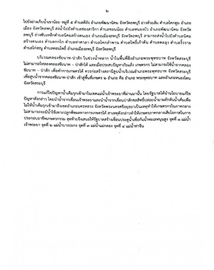 ตลอดจนควรก่อสร้างสถานีสูบน้ำบริเวณ อ.พระพุทธบาท จ.สระบุรี เพื่อสูบน้ำ จากคลองชัยนาท ป่าสัก เข้าสู่พื้นที่เกษตร ตลอดจนควรปล่อยน้ำจากเขื่อนเจ้าพระยา และเขื่อนป่าสักชลสิทธิ์ มาผลักดันน้ำเค็มเพื่อไม่ให้น้ำเค็มรุกเข้ามาถึงเขต อ.นครหลวง จ.พระนครศรีอยุธยา และทำให้เกษตรกรในภาคกลางไม่สามารถนำน้ำ ไปใช้เพื่อการเกษตรได้
