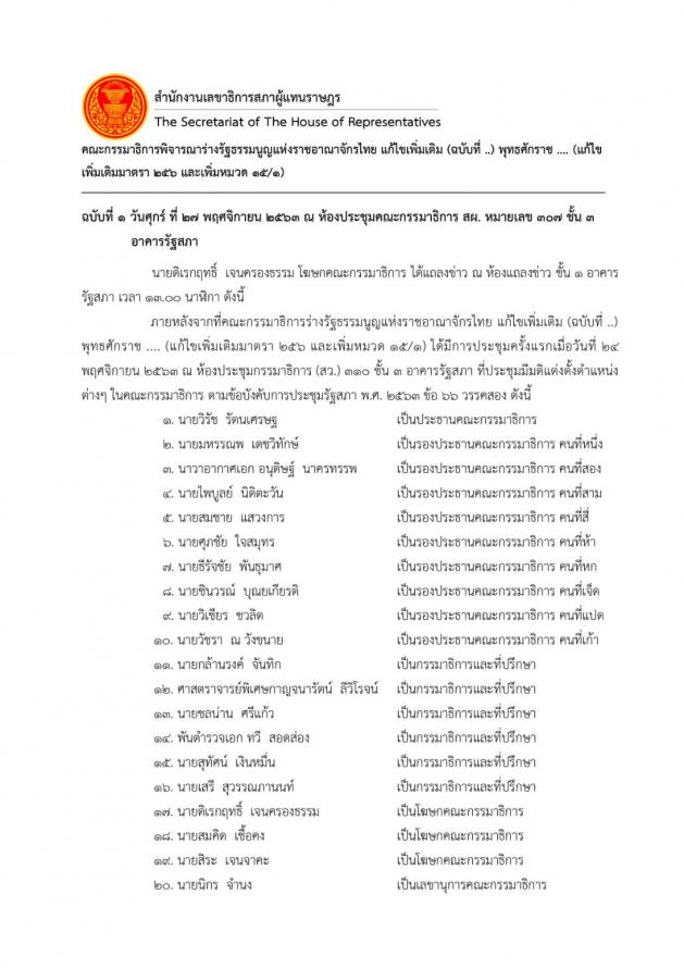 ซึ่งในการแก้ไขร่างรัฐธรรมนูญฉบับนี้มีหลักการสำคัญคือ การแก้ไขเพิ่มเติมตามมาตรา ๒๕๖ และเพิ่มหมวด ๑๕/๑ โดยมีการรับฟังความคิดเห็นของทุกภาคส่วน เพื่อให้สาธารณชนได้ตระหนักรับรู้และมีส่วนร่วมในการแสดงความคิดเห็นทุกช่องทาง ในประเด็นที่เกี่ยวกับการพิจารณาร่างรัฐธรรมนูญแห่งราชอาณาจักรไทย (รายละเอียดตามเอกสารที่แนบ)