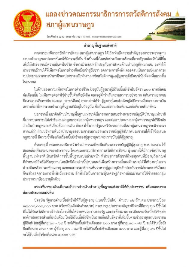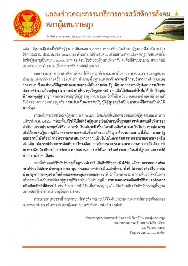 | วันพุธที่ ๑๖ ธันวาคม ๒๕๖๓ เวลา ๑๐.๑๕ นาฬิกา ณ ห้องแถลงข่าว ชั้น ๑ อาคารรัฐสภา น.ส.รังสิมา รอดรัศมี ประธานคณะกรรมาธิการ การสวัสดิการสังคม และคณะ แถลงข่าวว่า คณะกมธ. เห็นควรแก้ไขเพิ่มเติม พระราชบัญญัติผู้สูงอายุ พ.ศ. ๒๕๔๖ ให้สอดคล้องกับเจตนาของประชาชน ด้วยปัจจุบันผู้สูงอายุได้รับเบี้ยยังชีพในอัตราเดือนละ ๖๐๐ บาท ซึ่งไม่เพียงพอ ต่อค่าใช้จ่ายขั้นต่ำในการยังชีพ ส่งผลให้ผู้สูงอายุไทยส่วนใหญ่ไม่มีความมั่นคง ทางการเงิน โดยคณะ กมธ. ได้พิจารณาเห็นถึงความสำคัญของเรื่องดังกล่าว เพื่อเป็นการวางรากฐานระบบบำนาญของประเทศไทยให้มีความยั่งยืน ซึ่งเป็น หนึ่งในหลักประกันทางสังคมที่ภาครัฐจะต้องจัดให้มีขึ้นเพื่อให้ประชาชนมี ความมั่นคงในชีวิต จึงเห็นควรแก้ไขเพิ่มเติมพระราชบัญญัติผู้สูงอายุ พ.ศ. ๒๕๔๖ ให้สอดคล้องกับเจตนารมณ์ของประชาชน โดยมุ่งหมายให้มีการจัดบำนาญ พื้นฐานแห่งชาติเป็นสวัสดิการขั้นพื้นฐานแบบถ้วนหน้า โดยที่ประชากรสัญชาติ ไทยทุกคนที่มีอายุถึงเกณฑ์ที่กำหนด มีสิทธิ์ได้รับเบี้ยยังชีพผู้สูงอายุทุกคน ซึ่งคณะ กมธ. จะจัดทำเล่มรายงานผลการพิจารณาศึกษา เสนอต่อ สภาผู้แทนราษฎรให้พิจารณาดำเนินการต่อไป