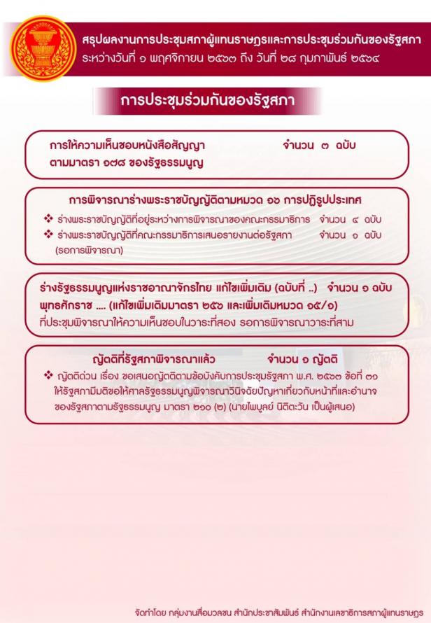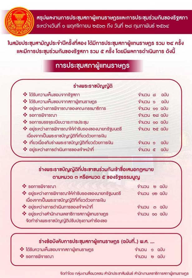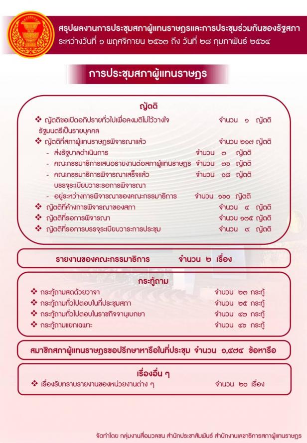 วันพุธที่ 3 มีนาคม 2564 เวลา 11.00 นาฬิกา ณ ห้องแถลงข่าว ชั้น 1 อาคารรัฐสภา นพ.สุกิจ อัถโถปกรณ์ ที่ปรึกษาประธานสภาผู้แทนราษฎร แถลงข่าวสรุปผลงานการประชุมสภาผู้แทนราษฎรและการประชุมร่วมกันของรัฐสภา ระหว่างวันที่ 1 พ.ย. 63 ถึงวันที่ 28 ก.พ. 64 โดยในสมัยประชุมสามัญประจำปีครั้งที่สอง มีการประชุมสภาผู้แทนราษฎร รวมจำนวน 25 ครั้ง ได้พิจารณาร่างพระราชบัญญัติ ซึ่งผ่านความเห็นชอบจากรัฐสภา จำนวน 8 ฉบับ และได้รับความเห็นชอบจากสภาผู้แทนราษฎร จำนวน 1 ฉบับ สำหรับการประชุมร่วมกันของรัฐสภา รวมจำนวน 5 ครั้ง มีการพิจารณาร่างพระราชบัญญัติร่างรัฐธรรมนูญแห่งราชอาณาจักรไทยแก้ไขเพิ่มเติม (ฉบับที่ ..) พุทธศักราช .... (แก้ไขเพิ่มเติมมาตรา 256 และเพิ่มเติมหมวด 15/1)หนังสือสัญญาตามมาตรา 178ของรัฐธรรมนูญ และญัตติต่าง ๆ (รายละเอียดตามเอกสารที่แนบ)