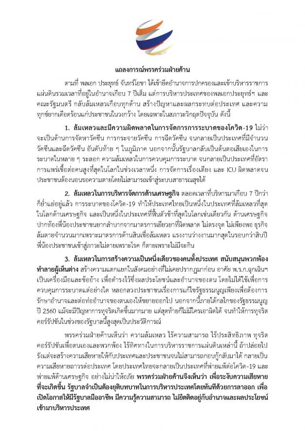 วันพุธที่ 28 เมษายน 2564 เวลา 10.15 นาฬิกา ณ บริเวณห้องโถง ชั้น 1 อาคารรัฐสภา นายสมพงษ์ อมรวิวัฒน์ ผู้นำฝ่ายค้านในสภาผู้แทนราษฎร และหัวหน้าพรรคเพื่อไทย พร้อมด้วยหัวหน้าพรรคการเมืองฝ่ายค้าน 5 พรรค ประกอบด้วย นายวันมูหะมัดนอร์ มะทา หัวหน้าพรรคประชาชาติ พล.ต.อ.เสรีพิศุทธ์ เตมียเวส หัวหน้าพรรคเสรีรวมไทย นายพิธา ลิ้มเจริญรัตน์ หัวหน้าพรรคก้าวไกล นายสงคราม กิจเลิศไพโรจน์ หัวหน้าพรรคเพื่อชาติ และนายนิคม บุญวิเศษ หัวหน้าพรรคพลังปวงชนไทย ร่วมแถลงข่าวแถลงการณ์พรรคร่วมฝ่ายค้าน เพื่อเรียกร้องให้ พล.อ.ประยุทธ์ จันทร์โอชา นายกรัฐมนตรี ลาออกจากตำแหน่ง เนื่องจากบริหารประเทศล้มเหลวเกือบทุกด้าน สร้างปัญหาและผลกระทบต่อประเทศ และเกิดความทุกข์ยากเดือดร้อนแก่ประชาชนในวงกว้าง โดยเฉพาะในสภาวะวิกฤตปัจจุบัน ดังนี้