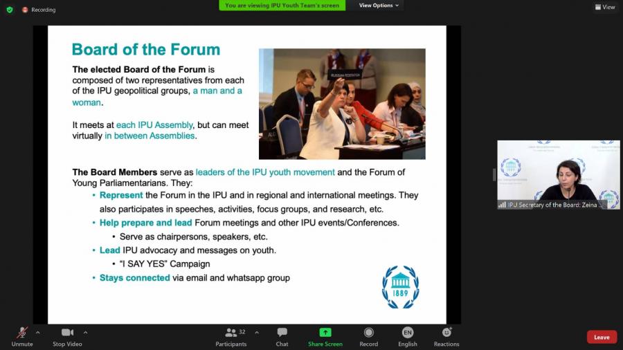 เมื่อวันศุกร์ที่ 14 พฤษภาคม 2564 เวลา 19.00 - 21.00 นาฬิกา ตามเวลาประเทศไทย ณ ห้องประชุมสำนักองค์การรัฐสภาระหว่างประเทศ นายอิสระ เสรีวัฒนวุฒิ สมาชิกสภาผู้แทนราษฎร ในฐานะผู้แทนรัฐสภาไทยและกรรมการบริหารการประชุมยุวสมาชิกรัฐสภา (Member of the Board of the IPU Forum of Young Parliamentarians) เข้าร่วมการประชุมคณะกรรมการบริหารการประชุมยุวสมาชิกรัฐสภาชุดใหม่ ครั้งแรก ผ่านระบบ Zoom ในห้วงการประชุมสมัชชาสหภาพรัฐสภา ครั้งที่ 142