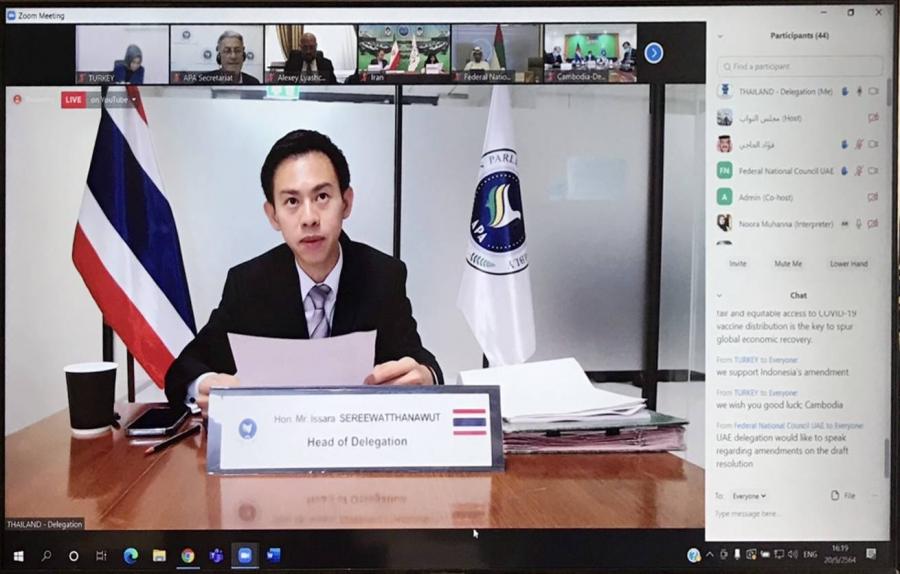 วันพฤหัสบดีที่ 20 พฤษภาคม 2564 เวลา 14.00 นาฬิกา คณะผู้แทนรัฐสภาไทยในการประชุมคณะ กมธ. ว่าด้วยเศรษฐกิจและการพัฒนาที่ยั่งยืนของสมัชชารัฐสภาเอเชีย (Asian Parliamentary Assembly - APA) ประกอบด้วย นายอิสระ เสรีวัฒนวุฒิ สมาชิกสภาผู้แทนราษฎร ในฐานะหัวหน้าคณะผู้แทนรัฐสภาไทย และนายดล เหตระกูล สมาชิกสภาผู้แทนราษฎร ในฐานะผู้แทนรัฐสภาไทย เข้าร่วมการประชุมคณะ กมธ. ว่าด้วยเศรษฐกิจและการพัฒนาที่ยั่งยืนในรูปแบบการประชุมผ่านสื่ออิเล็กทรอนิกส์ ซึ่งมีนาย Ahmed Alsaloom สมาชิกรัฐสภาบาห์เรน ทำหน้าที่ประธานการประชุม ในการนี้ นายอิสระ เสรีวัฒนวุฒิ ได้กล่าวถ้อยแถลงเพื่อแสดงความคิดเห็นในร่างข้อมติฉบับที่ 7 ร่างข้อมติว่าด้วยความริเริ่มทางการเงินเพื่อพัฒนาสภาพภูมิอากาศในภูมิภาคเอเชีย (Draft Resolution on Asian Climate Financial Initiative) ซึ่งเสนอโดยคณะผู้แทนรัสเซียใน APA