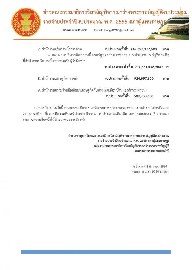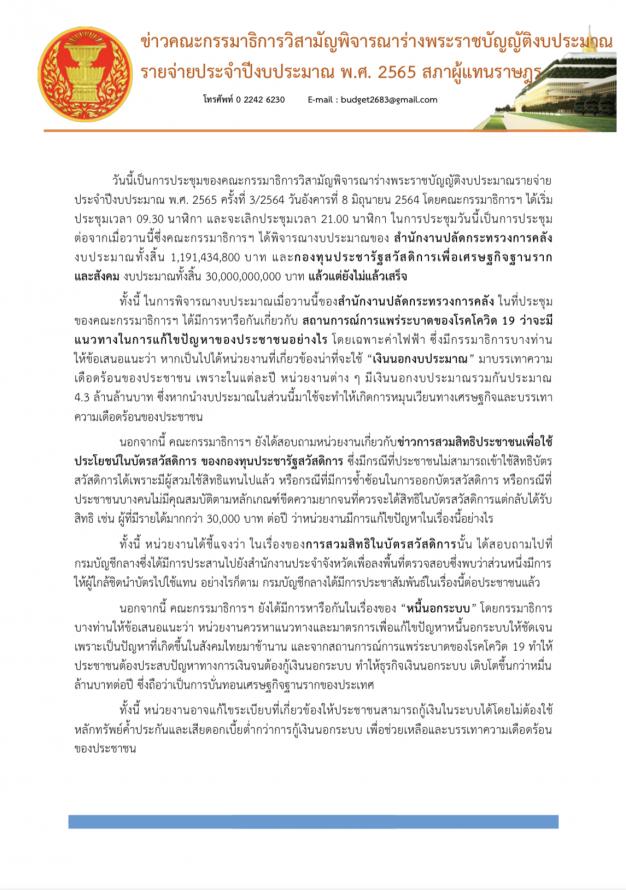 ทั้งนี้ ในการพิจารณางบประมาณของสำนักงานปลัดกระทรวงการคลัง ได้มีการหารือเกี่ยวกับแนวทางในการแก้ไขปัญหาให้แก่พี่น้องประชาชนในช่วงการแพร่ระบาดของโรคติดเชื้อไวรัสโคโรนา 2019 (โควิด-19)