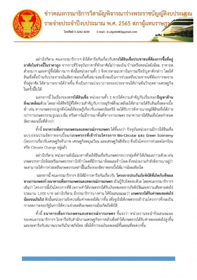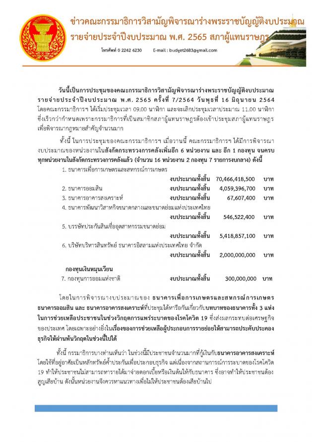 วันพุธที่ 16 มิถุนายน 2564 เวลา 11.30 นาฬิกา ณ ห้องแถลงข่าว ชั้น 1 อาคารรัฐสภา นายสรวุฒิ เนื่องจำนงค์ นายสาคร เกี่ยวข้อง โฆษกคณะกรรมาธิการวิสามัญพิจารณาร่างพระราชบัญญัติงบประมาณรายจ่ายประจำปีงบประมาณพ.ศ. 2565 และร.อ.จองชัย วงศ์ทรายทอง ส.ส.พรรคพลังประชารัฐ แถลงข่าวเกี่ยวกับผลการประชุมและความคืบหน้าในการพิจารณาร่าง พ.ร.บ. งบประมาณรายจ่ายประจำปีงบประมาณ พ.ศ. 2565 ของคณะ กมธ. โดยเมื่อวันที่ 15 มิ.ย. 64 เป็นการพิจารณางบประมาณของหน่วยงานในสังกัดกระทรวงการคลังเพิ่มอีก 6 หน่วยงาน และ 1 กองทุน จนครบทุกหน่วยงานในสังกัดกระทรวงการคลังแล้ว และสำหรับในวันนี้ (16 มิ.ย. 64) เป็นการพิจารณาหน่วยงานในสังกัดกระทรวงพาณิชย์ 5 หน่วยงาน (รายละเอียดตามเอกสารที่แนบ)