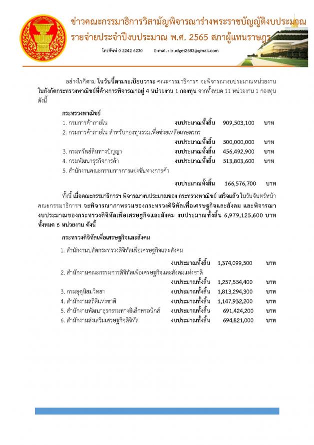 ผลการประชุมและความคืบหน้าในการพิจารณาร่าง พ.ร.บ. งบประมาณรายจ่ายประจำปีงบประมาณ พ.ศ. 2565 โดยขณะนี้ คณะ กมธ. ได้พิจารณางบประมาณของกระทรวงการคลัง และหน่วยงานในสังกัดกระทรวงพาณิชย์จำนวน 6 หน่วยงานเสร็จเรียบร้อยแล้ว สำหรับในวันนี้ (18 มิ.ย. 64) เป็นการประชุม ครั้งที่ 9/2564 เพื่อพิจารณางบประมาณหน่วยงานในสังกัดกระทรวงพาณิชย์ที่ค้างการพิจารณาอยู่ 4 หน่วยงาน 1 กองทุน ได้แก่ กรมการค้าภายใน กองทุนรวมเพื่อช่วยเหลือเกษตรกร กรมทรัพย์สินทางปัญญา กรมพัฒนาธุรกิจการค้า และสำนักงานคณะกรรมการการแข่งขันทางการค้า