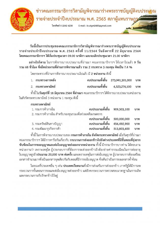 วันอังคารที่ 22 มิถุนายน 2564 เวลา 14.00 นาฬิกา ณ ห้องแถลงข่าว ชั้น 1 อาคารรัฐสภา น.ส.ธีรรัตน์ สำเร็จวาณิชย์ และนายจิรายุ ห่วงทรัพย์ และ โฆษกคณะ กมธ.วิสามัญพิจารณาร่าง พ.ร.บ.งบประมาณรายจ่ายประจำปีงบประมาณ พ.ศ. 2565 แถลงข่าวเกี่ยวกับผลการประชุมและความคืบหน้าในการพิจารณาร่าง พ.ร.บ.งบประมาณรายจ่ายประจำปีงบประมาณ พ.ศ. 2565 ในการพิจารณางบประมาณที่ผ่านมาคณะ กมธ. ใช้เวลาไปแล้ว 9 วัน รวม 68 ชม. ซึ่งมีหน่วยงานที่ผ่านการพิจารณาแล้ว รวม 2 กระทรวง 3 กองทุน คิดเป็นร้อยละ 7.4 โดยกระทรวงที่ผ่านการพิจารณางบประมาณไปแล้ว มี 2 หน่วยงาน ดังนี้ กระทรวงการคลัง งบประมาณทั้งสิ้น 273,941,301,000 บาท 2. กระทรวงพาณิชย์ งบประมาณทั้งสิ้น 6,523,276,100 บาท