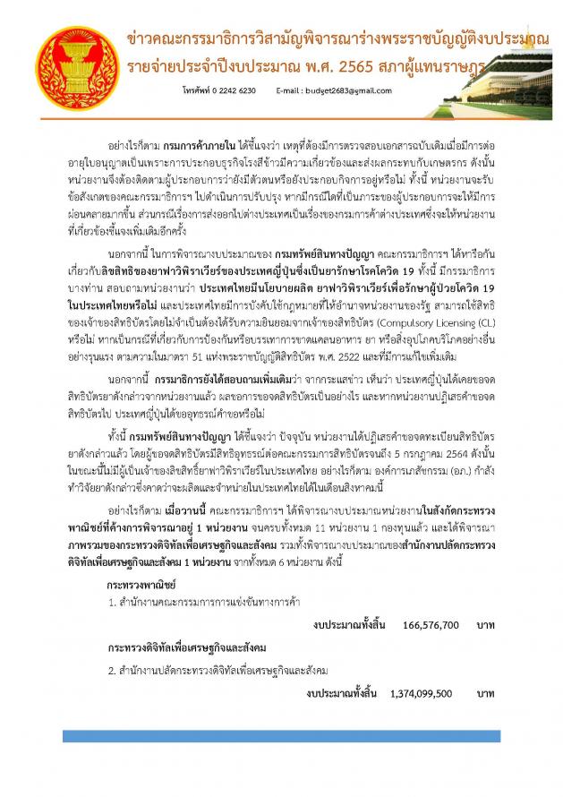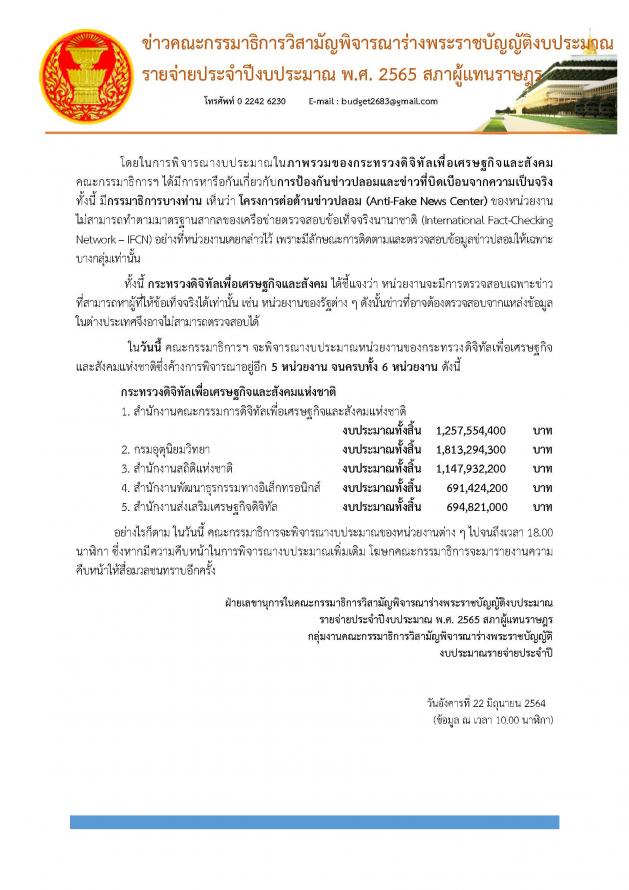ทั้งนี้ ในวันศุกร์ที่ 18 มิ.ย. 64 ที่ผ่านมา คณะกมธ. ได้พิจารณางบประมาณหน่วยงานในสังกัดกระทรวงพาณิชย์ 3 หน่วยงาน 1 กองทุน ซึ่งในการพิจารณางบประมาณของ กรมการค้าภายใน สังกัดกระทรวงพาณิชย์ ซึ่งคณะ กมธ.ได้มีการหารือกันเกี่ยวกับ กระบวนการส่งออกข้าวไปยังต่างประเทศที่มีขั้นตอนที่ยุ่งยากชับซ้อนในการขออนุญาตและต่อใบอนุญาตส่งออกจากหน่วยงาน นอกจากนี้ในการพิจารณางบประมาณของกรมทรัพย์สินทางปัญญา คณะกมธ.ได้หารือเกี่ยวกับลิขสิทธิ์ของยาฟาวิพิราเวียร์ของประทศญี่ปุ่นซึ่งเป็นยารักษาโรคโควิด 19 และคณะ กมธ. ได้พิจารณางบประมาณหน่วยงานในสังกัดกระทรวงพาณิชย์ที่ค้างการพิจารณาอยู่ 1 หน่วยงาน จนครบทั้งหมด 11 หน่วยงาน 1 กองทุนแล้ว และได้พิจารณาภาพรวมของกระทรวงดิจิทัลเพื่อเศรษฐกิจและสังคม รวมทั้งพิจารณางบประมาณของสำนักงานปลัดกระทรวงดิจิทัลเพื่อเศรษฐกิจและสังคม 1 หน่วยงาน จากทั้งหมด 6 หน่วยงาน และได้มีการหารือกันเกี่ยวกับการป้องกันข่าวปลอมและข่าวที่บิดเบือนจากความเป็นจริง เช่น โครงการต่อต้านข่าวปลอม (Anti-Fake News Center) ของหน่วยงานไม่สามารถทำตามมาตรฐานสากลของเครือข่ายตรวจสอบข้อเท็จจริงนานาชาติ (International Fact-Checking Network- IFCN) อย่างที่หน่วยงานเคยกล่าวไว้ (รายละเอียดตามเอกสารแนบ)