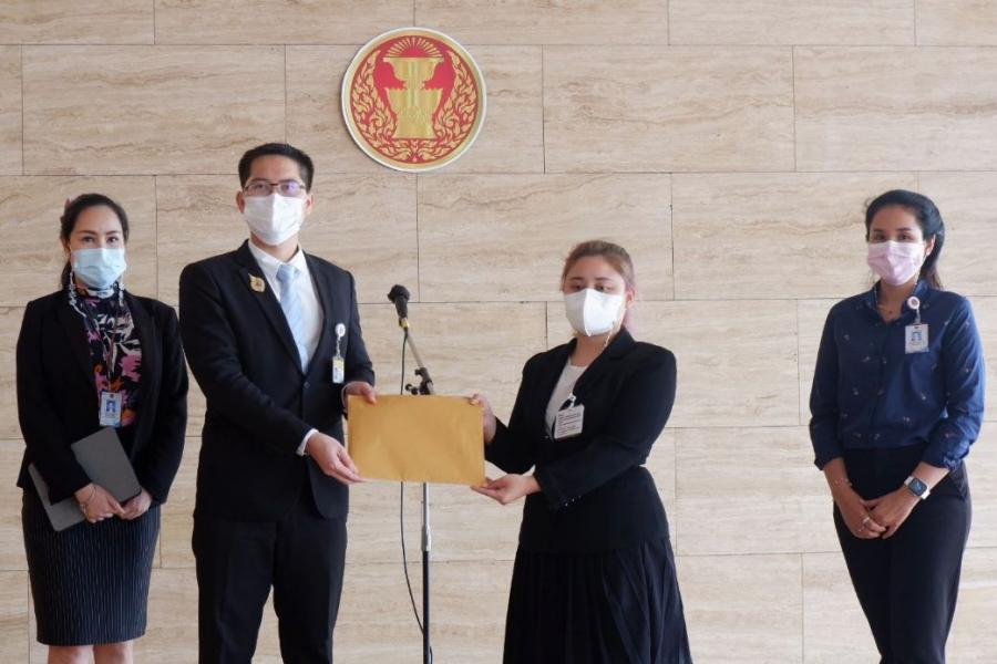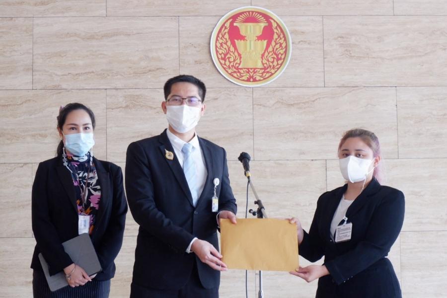 นายมงคลกิตติ์ สุขสินธารานนท์ สมาชิกสภาผู้แทนราษฎร พรรคไทยศรีวิไลย์ รับยื่นหนังสือจาก น.ส.ภริษา คงเศรษฐกุล แม่ค้าออนไลน์