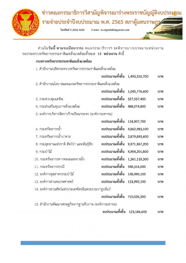 วันพฤหัสบดีที่ 24 มิถุนายน 2564 เวลา 13.45 นาฬิกา ณ ห้องแถลงข่าว ชั้น 1 อาคารรัฐสภา นายจิรายุ ห่วงทรัพย์ และ น.ส.ธีรรัตน์ สำเร็จวาณิชย์ โฆษกคณะ กมธ.วิสามัญพิจารณาร่าง พ.ร.บ.งบประมาณรายจ่ายประจำปีงบประมาณ พ.ศ. 2565 แถลงข่าวผลการประชุมและความคืบหน้าในการพิจารณาร่าง พ.ร.บ.งบประมาณรายจ่ายประจำปีงบประมาณ พ.ศ. 2565 ซึ่งใช้เวลาการพิจารณาไปแล้ว 11 วัน รวม 86 ชั่วโมง โดยมีหน่วยงานที่ผ่านการพิจารณาแล้ว 3 กระทรวง ได้แก่ กระทรวงการคลัง กระทรวงพาณิชย์ และกระทรวงดิจิทัลเพื่อเศรษฐกิจและสังคมแห่งชาติ งบประมาณทั้งสิ้น 6,979,125,600 บาท และ 3 กองทุน คิดเป็น ร้อยละ 11.1 ซึ่งในวันนี้ คณะ กมธ. จะพิจารณางบประมาณของกระทรวงทรัพยากรธรรมชาติและสิ่งแวดล้อม และหน่วยงานในกำกับ จำนวน 15 หน่วยงาน (รายละเอียดตามเอกสารที่แนบ)