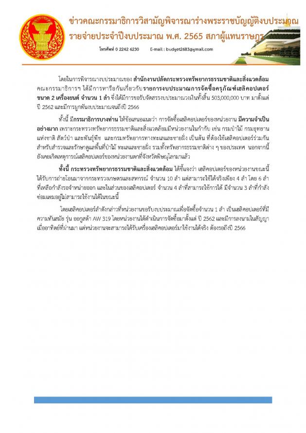 โดยในช่วงการพิจารณางบประมาณของสำนักงานปลัดกระทรวงทรัพยากรธรรมชาติและสิ่งแวดล้อม มีการหารือเกี่ยวกับรายการงบประมาณการจัดซื้อครุภัณฑ์เฮลิคอปเตอร์ ขนาด 2 เครื่องยนต์ จำนวน 1 ลำ ซึ่งมีความจำเป็นอย่างมากเพราะกระทรวงมีหน่วยงานในสังกัดที่ต้องใช้เฮลิคอปเตอร์ร่วมกันสำหรับสำรวจและรักษาดูแลพื้นที่ป่าไม้ ทะเลชายฝั่ง รวมทั้งทรัพยากรธรรมชาติต่าง ๆ ของประเทศ นอกจากนี้ คณะ กมธ. ได้พิจารณาแต่งตั้งคณะอนุ กมธ. จำนวน 10 คณะ เนื่องจากสถานการณ์โควิด-19 ส่งผลให้การพิจารณาล่าช้าจึงต้องเร่งดำเนินการให้เสร็จสิ้นภายในกรอบระยะเวลาที่กำหนด และสนับสนุนการพิจารณาของคณะ กมธ. ให้มีความละเอียดรอบคอบมากยิ่งขึ้น