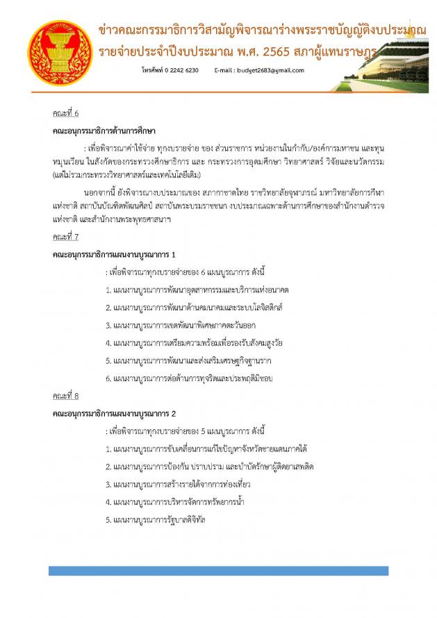 วันศุกร์ที่ 25 มิถุนายน 2564 เวลา 11.30 นาฬิกา ณ ห้องแถลงข่าว ชั้น 1 อาคารรัฐสภา นายเรืองไกร ลีกิจวัฒนะ โฆษกคณะ กมธ. วิสามัญพิจารณาร่างพระราชบัญญัติงบประมาณรายจ่ายประจำปีงบประมาณ พ.ศ. 2565 แถลงข่าวความคืบหน้าการพิจารณาของคณะ กมธ. ว่า หน่วยงานที่ผ่านการพิจารณาแล้ว 3 กระทรวง ได้แก่ กระทรวงการคลัง กระทรวงพาณิชย์ กระทรวงดิจิทัลเพื่อเศรษฐกิจและสังคมแห่งชาติ โดยเมื่อวานนี้ (24 มิ.ย. 64) มีการพิจารณางบประมาณหน่วยงานในสังกัดกระทรวงทรัพยากรธรรมชาติและสิ่งแวดล้อม จำนวน 5 หน่วยงาน เสร็จเรียบร้อยแล้ว ดังนี้ สำนักงานปลัดกระทรวงทรัพยากรธรรมชาติและสิ่งแวดล้อม สำนักนโยบายและแผนทรัพยากรธรรมชาติและสิ่งแวดล้อม กรมควบคุมมลพิษ กรมส่งเสริมคุณภาพสิ่งแวดล้อม และองค์การบริหารจัดการก๊าซเรือนกระจก (องค์การมหาชน)