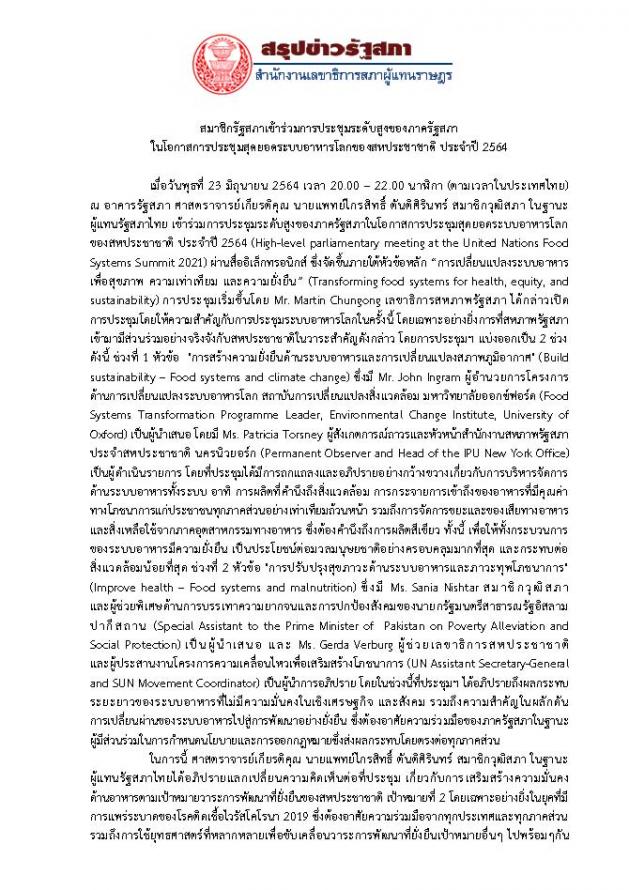 สมาชิกรัฐสภาเข้าร่วมการประชุมระดับสูงของภาครัฐสภาในโอกาสการประชุมสุดยอดระบบอาหารโลกของสหประชาชาติ ประจำปี 2564