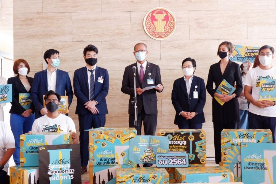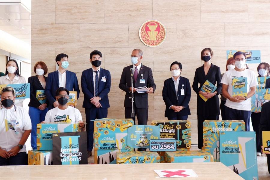 นายสมบูรณ์ อุทัยเวียนกุล เลขานุการประธานสภาผู้แทนราษฎร และน.ส.ผ่องศรี ธาราภูมิ คณะทำงานทางการเมืองของประธานสภาผู้แทนราษฎร รับยื่นหนังสือจาก นายปิยบุตร แสงกนกกุล อดีต ส.ส. พรรคอนาคตใหม่ นายพริษฐ์ วัชรสินธุ ตัวแทนกลุ่ม Re-Solution และคณะ