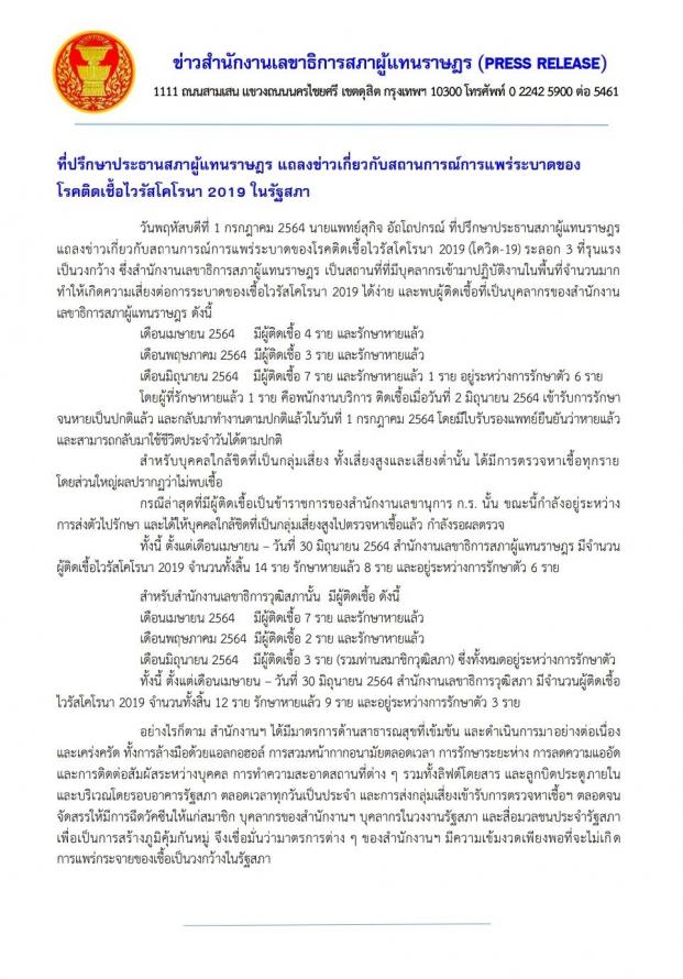 อย่างไรก็ตาม ขอเรียนให้ทราบถึงกรณีที่มีผู้ติดเชื้อล่าสุด ตามที่ท่านได้กล่าวหาว่าทางสภาปกปิดข้อมูลนั้น ผู้ติดเชื้อรายดังกล่าวเป็นข้าราชการของสภาแต่ในขณะเดียวกันนอกเวลาราชการได้ขายโจ๊กที่ห้องอาหารชั้น 1 ด้วยและได้มาทำงานทั้งสองแห่งทุกวันยกเว้นวันเสาร์และอาทิตย์ซึ่งเมื่อวันที่ 29 มิถุนายน 2564 ได้ไปตรวจหาเชื้อโควิดพบว่าติดเชื้อ ทั้งนี้ ขอเรียนว่าผู้ติดเชื้อโควิดไม่ได้มีความผิดอะไร แต่กลับเป็นผู้ที่น่าเห็นใจด้วยซ้ำ โดยได้โทรศัพท์ไปพูดคุยสอบถามกับผู้ติดเชื้อโควิดแล้วทราบว่ามีอาการไม่รุนแรงและบุคคลในครอบครัวก็ไม่มีผู้ใดติดเชื้อด้วย